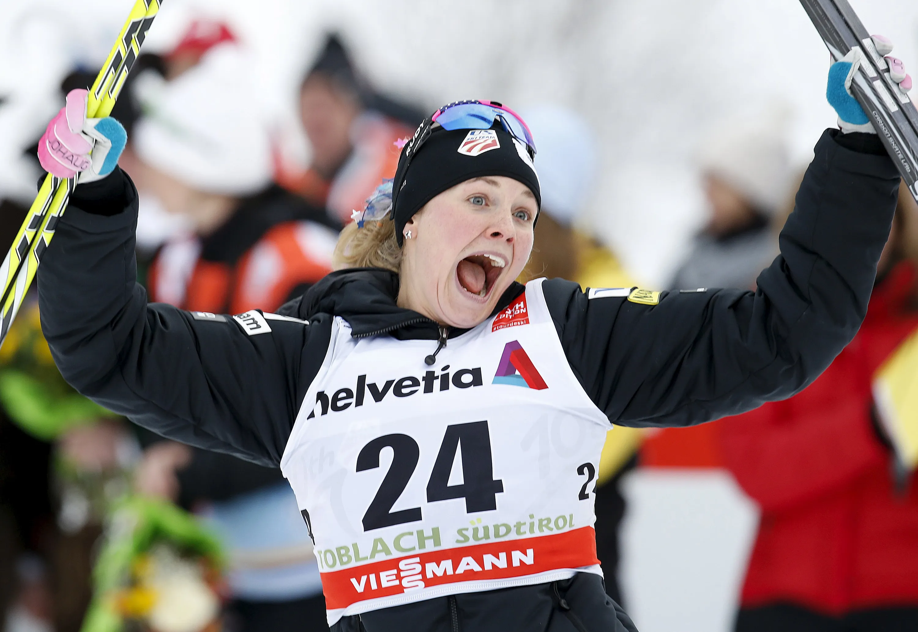 Jessica Diggins of the U.S. celebrates after winning the women's FIS Tour de ski cross-country skiing 5km individual free race in Toblach January 8, 2016. (Photo by Alessandro Garofalo/Reuters)