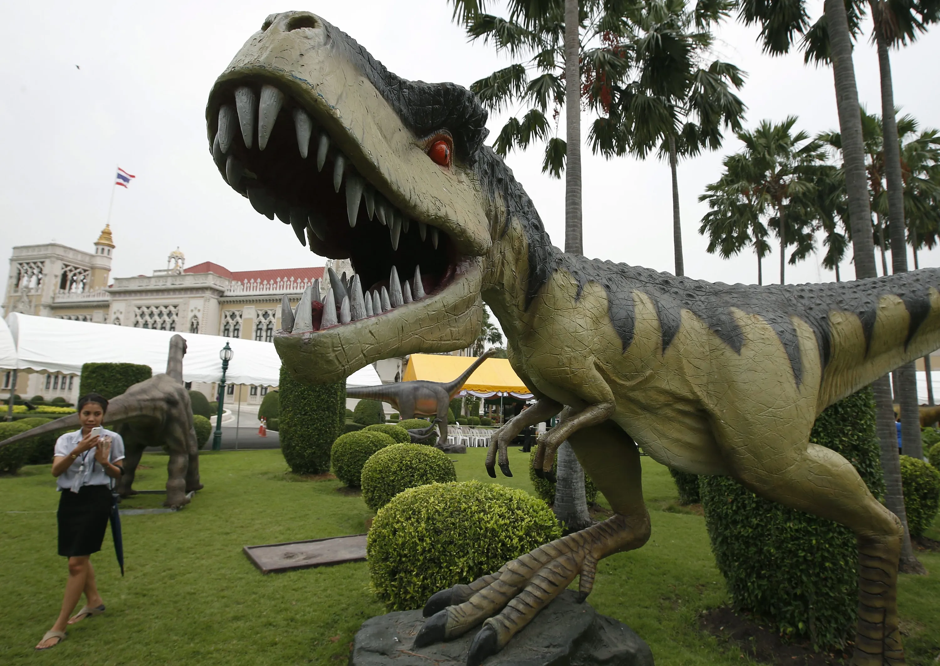 A government official takes a souvenir photo of a scale model of a dinosaur which was set up to decorate the National Children's Day on the compound of the Government House (background), as preparations for the event are going on, in Bangkok, Thailand, 08 January 2016. A variety of dinosaur models is many sizes are hoped to attract and entretain some several hundreds of young Thai children who are expected to visit the venue on the National Children's Day on 09 January 2016. This annual event in Thailand acknowledges the rights of children. (Photo by Narong Sangnak/EPA)