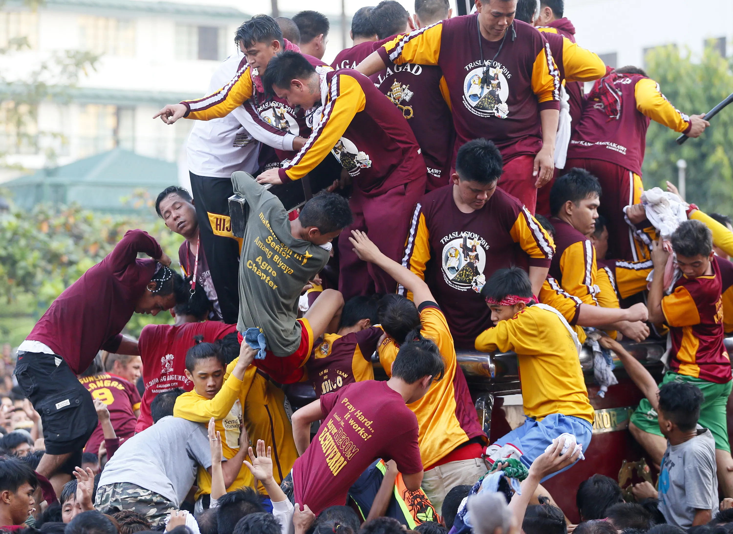 A few Catholic devotees manage to get closer to either kiss or rub with towels, the cross of the image of the Black Nazarene as they take part in a raucous procession to celebrate its feast day in Manila, Philippines, Saturday, January 9, 2016. (Photo by Bullit Marquez/AP Photo)