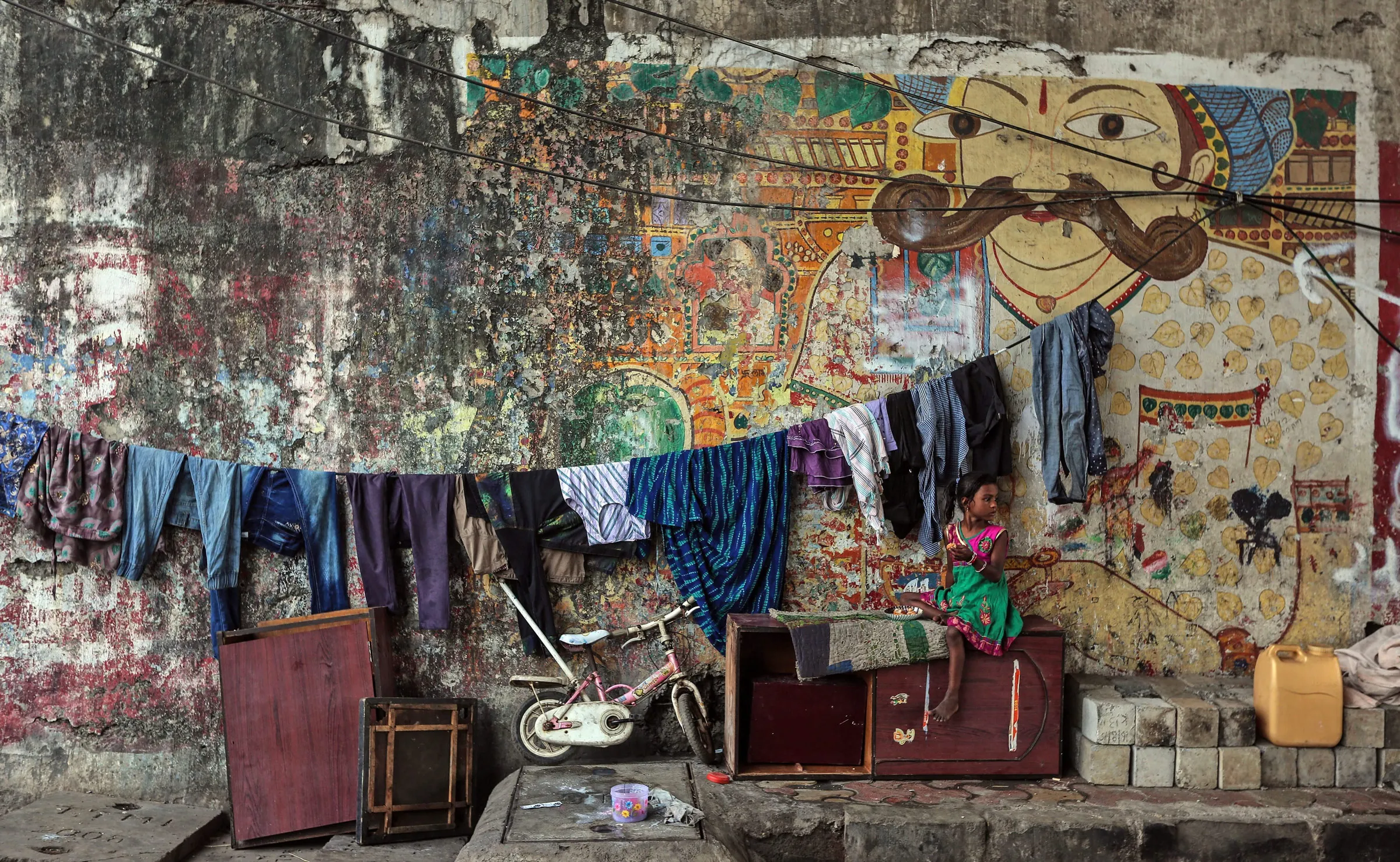A homeless Indian girl sits on a toppled piece of furniture as she has a meal in front of a mural in a downtown street of Mumbai, India, 07 January 2016. According to a recent report in an Indian national newspaper more than 9,000 children in Mumbai go hungry every day and the first-ever census of street children conducted by the Tata Institute of Social Sciences (TISS) and the voluntary organization Action Aid India suggest that more than 37,000 children live on the streets of the Indian metropole. (Photo by Divyakant Solanki/EPA)
