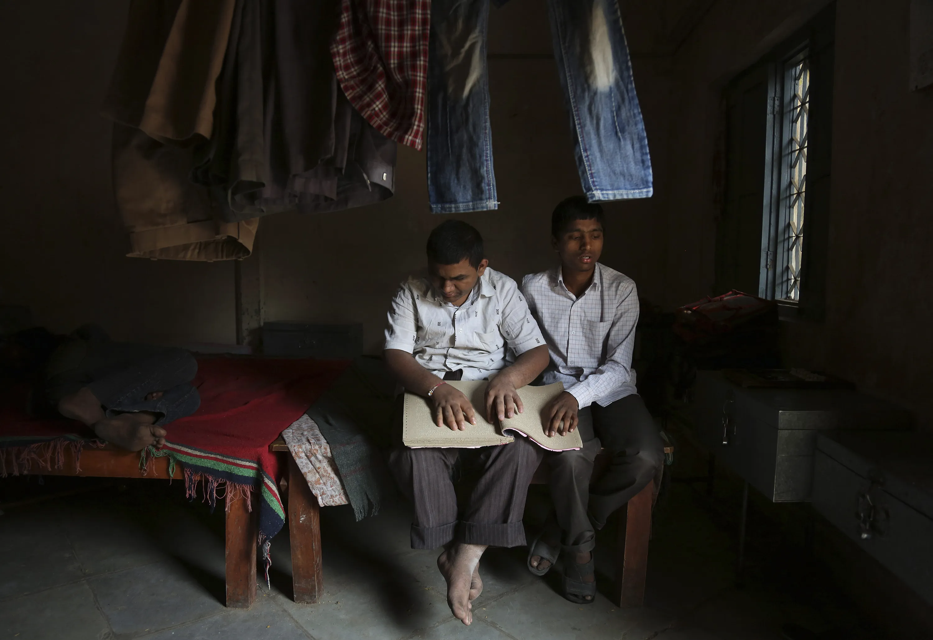 Indian students with visual disabilities read a book in braille at a government-run hostel in Hyderabad, India, Monday, January 4, 2016. Jan. 4 marks the birth anniversary of Louis Braille, French inventor who devised a system used by the blind for reading and writing which has since been adapted to almost every known language. (Photo by Mahesh Kumar A./AP Photo)