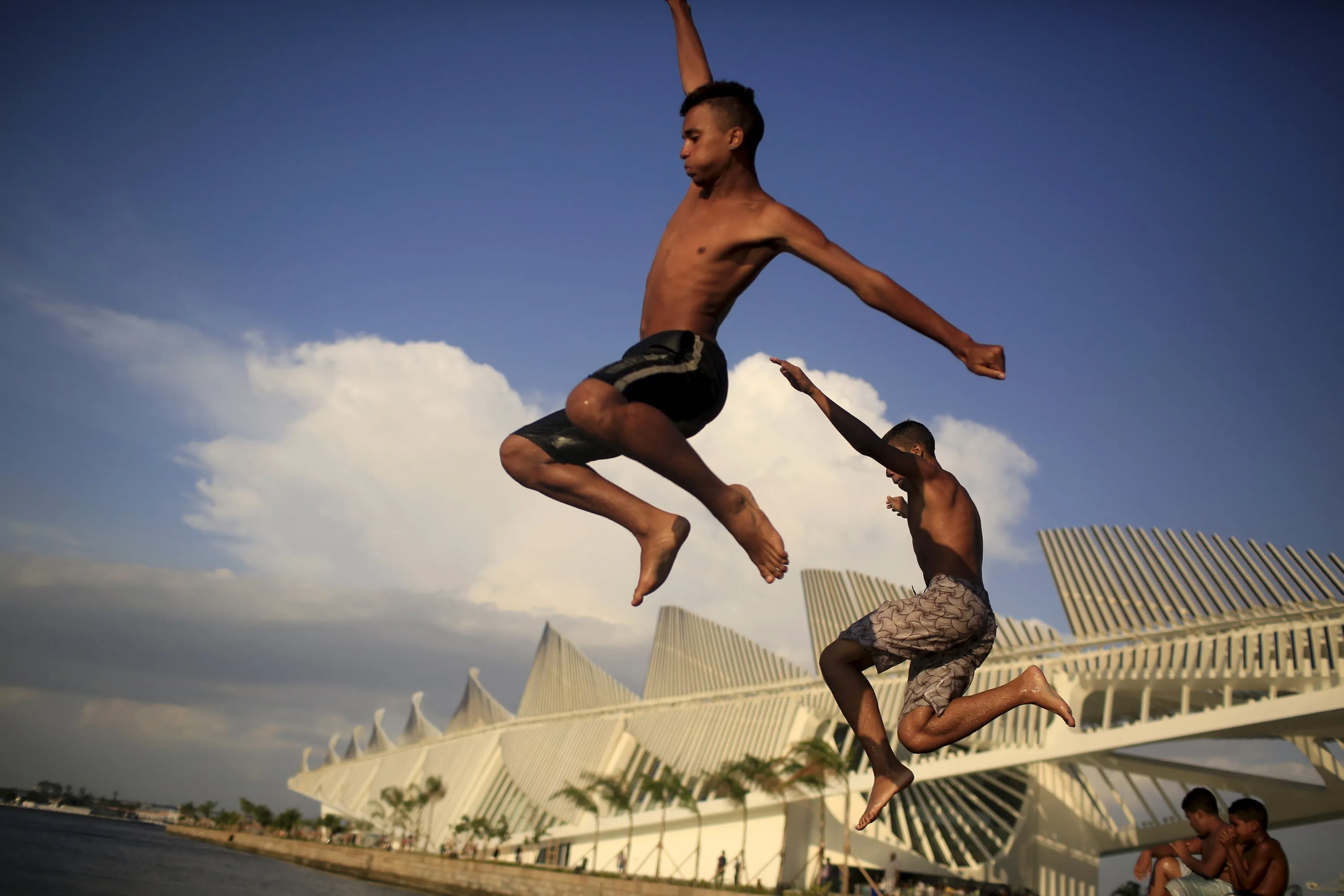 Boys dive into the Guanabara Bay in front of the "Museu do Amanha" (Museum of Tomorrow), in the port of Rio de Janeiro, Brazil, January 8, 2016. (Photo by Pilar Olivares/Reuters)