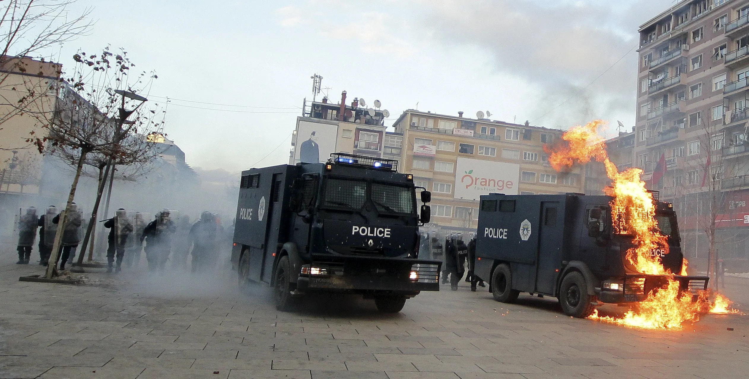 A police vehicle is set on fire by protesters during clashes in Pristina, Kosovo January 9, 2016. (Photo by Agron Beqiri/Reuters)