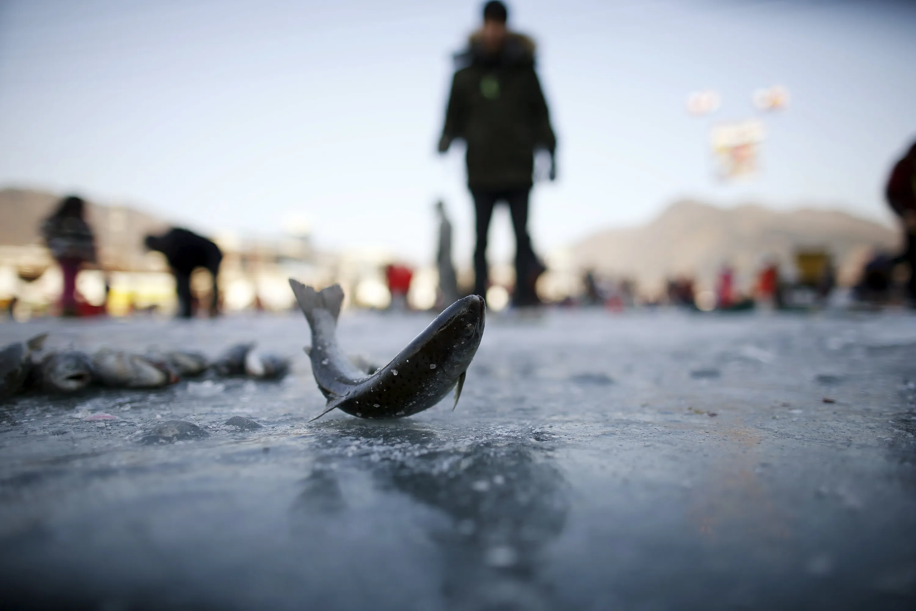 People fish for trout through holes in a frozen river in Hwacheon, south of the demilitarized zone (DMZ) separating the two Koreas, January 9, 2016. (Photo by Kim Hong-Ji/Reuters)