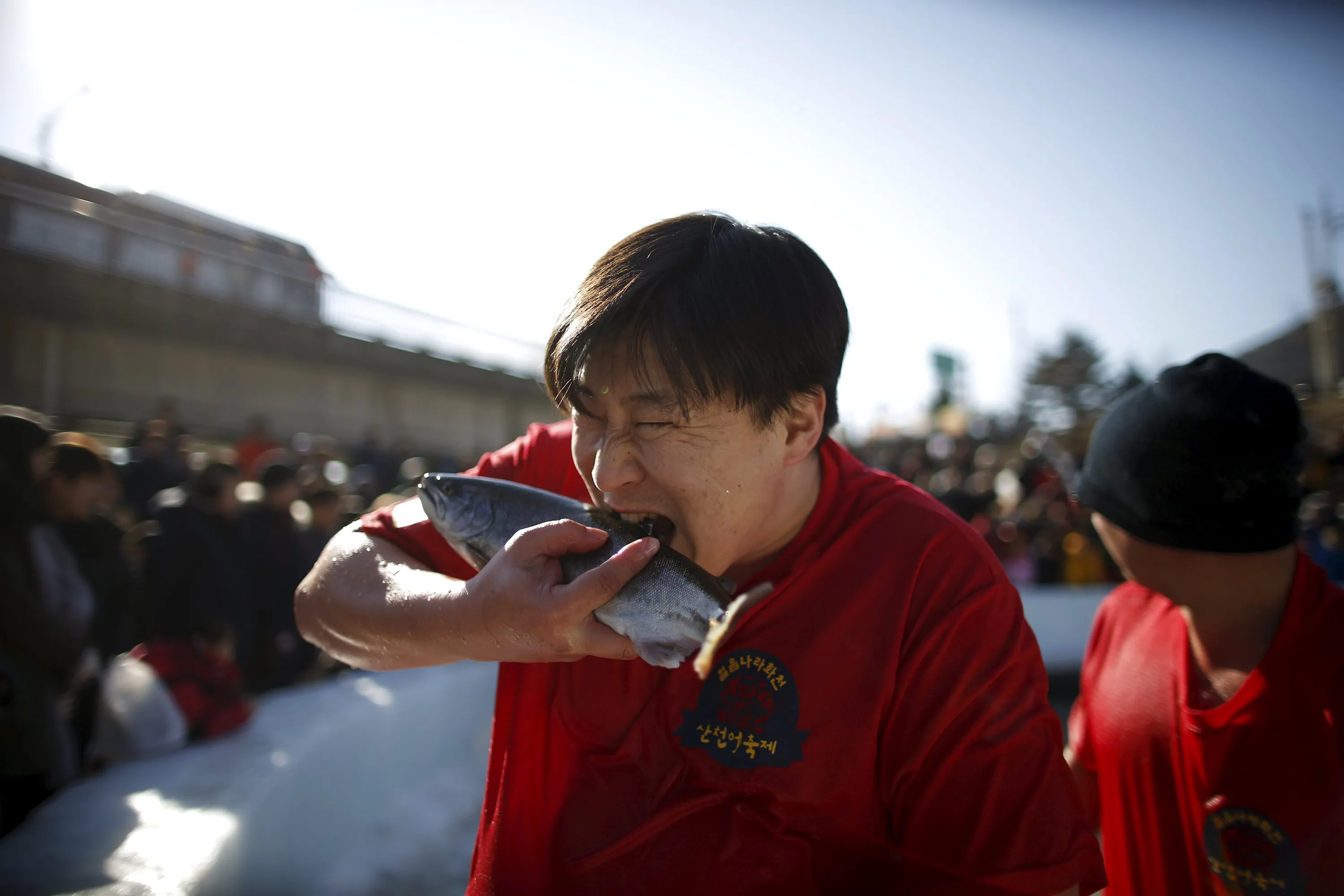 A participant bites a trout after catching it with his hands during an event promoting the Ice Festival on a frozen river in Hwacheon, south of the demilitarized zone (DMZ) separating the two Koreas, January 9, 2016. (Photo by Kim Hong-Ji/Reuters)