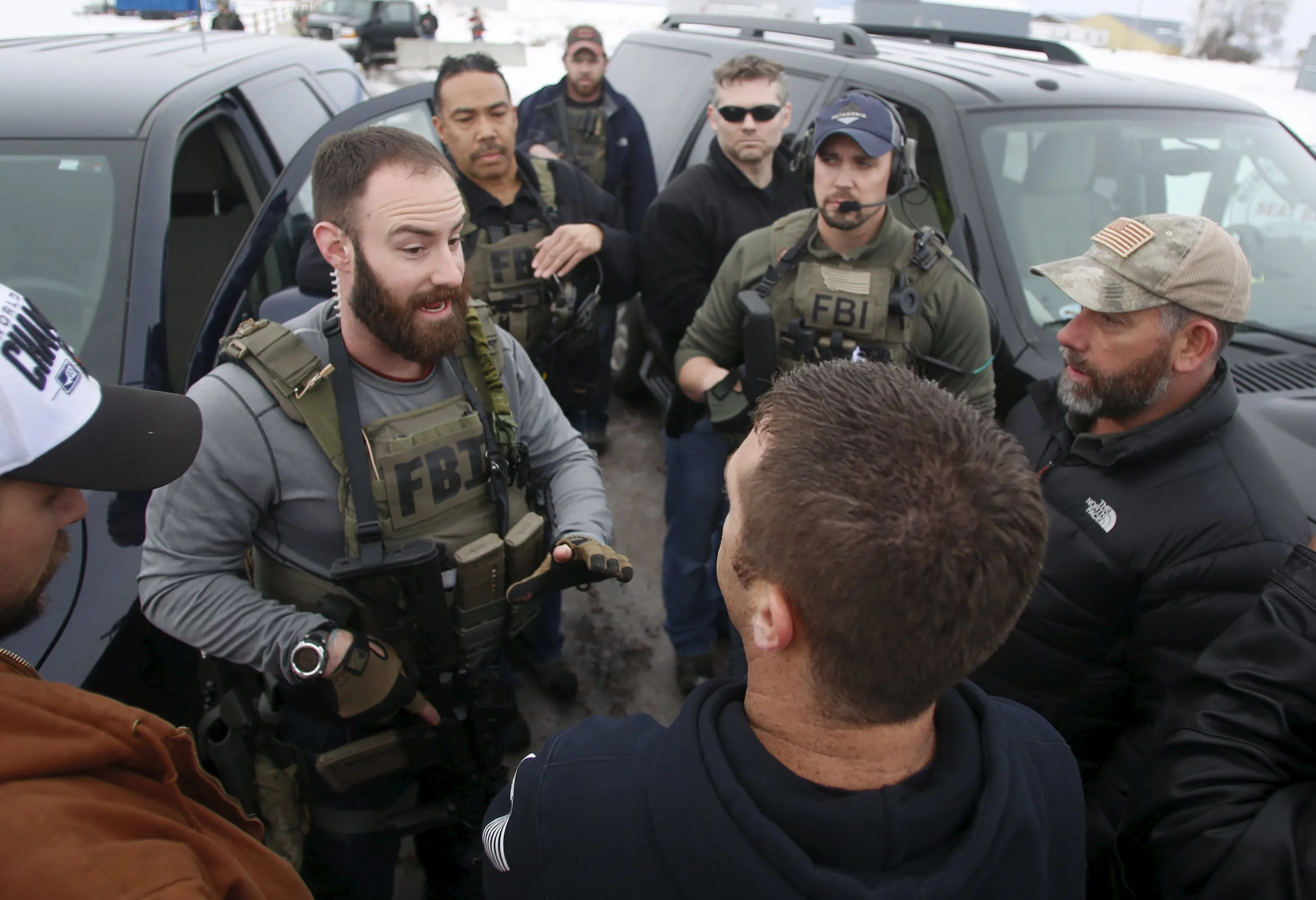FBI agents at the Burns Municipal Airport meet with members of the Pacific Patriots Network, who are attempting to resolve the occupation at the Malheur National Wildlife Refuge, near Burns, Oregon, January 9, 2016. (Photo by Jim Urquhart/Reuters)