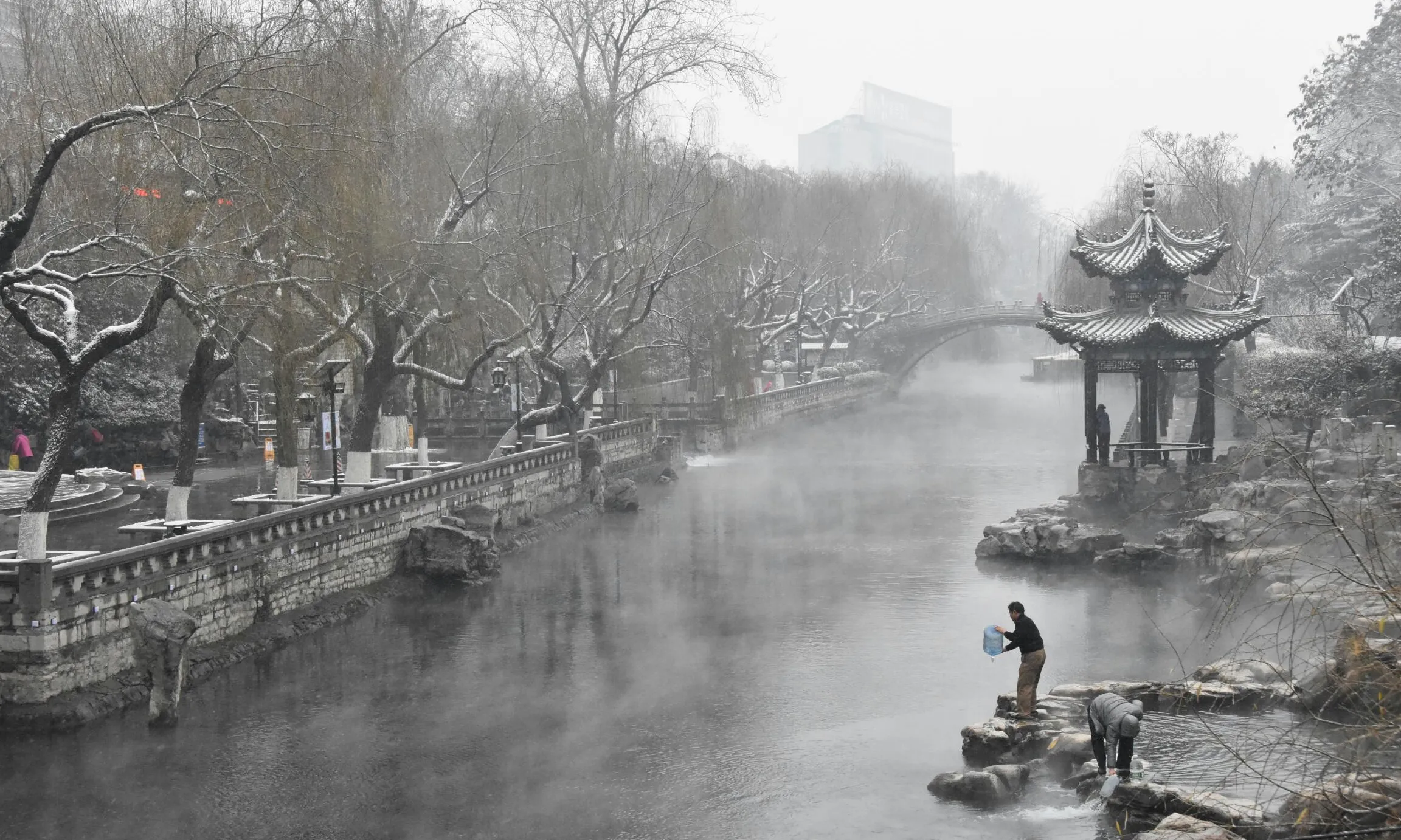 A man takes water from a moat as snow turns the city into a winter wonderland in Jinan, China on January 6, 2016. (Photo by Feng Jie/Xinhua Press/Corbis)
