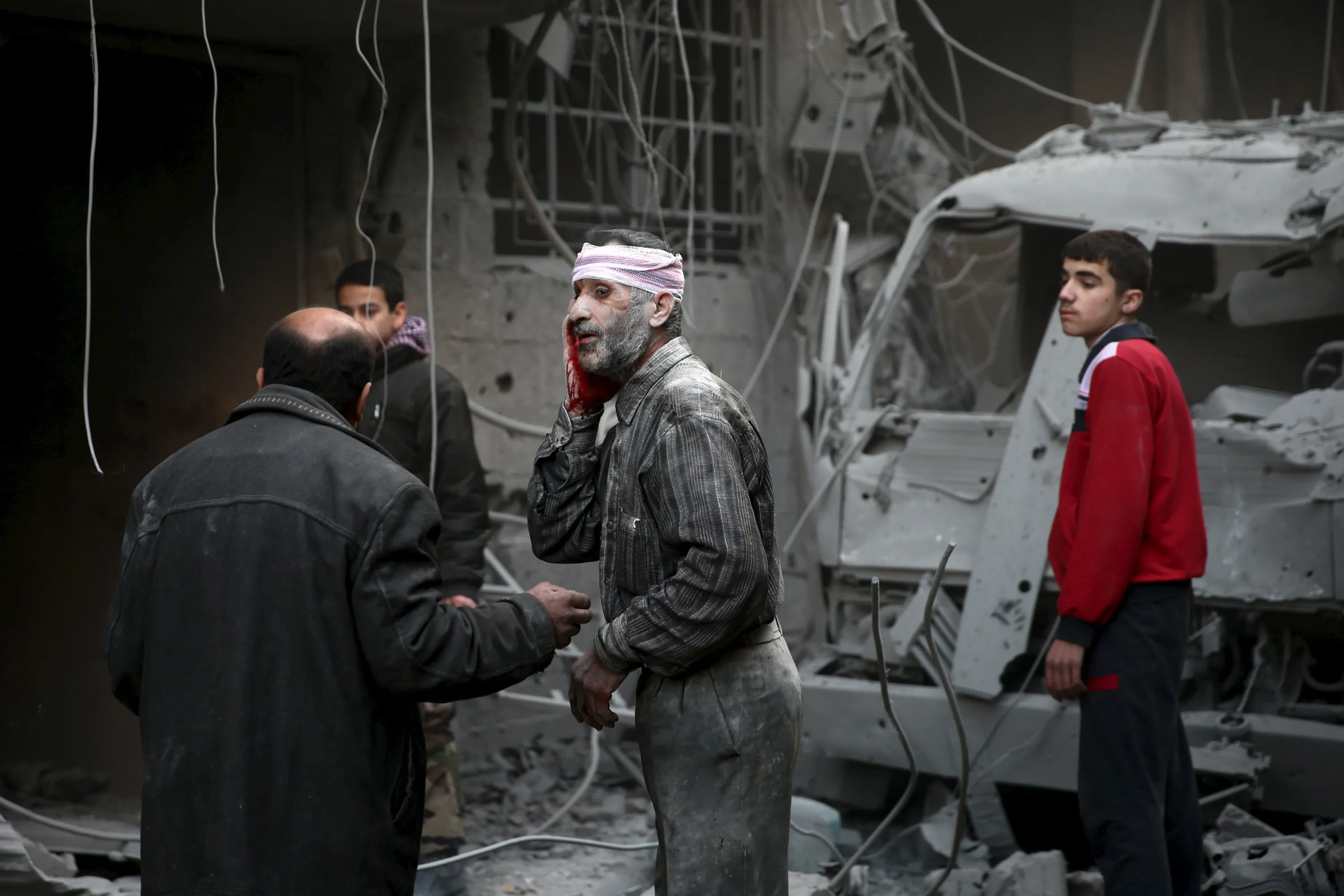 An injured man stands in a site hit by what activists said were airstrikes carried out by the Russian air force in the town of Douma, eastern Ghouta in Damascus, Syria January 10, 2016. (Photo by Bassam Khabieh/Reuters)