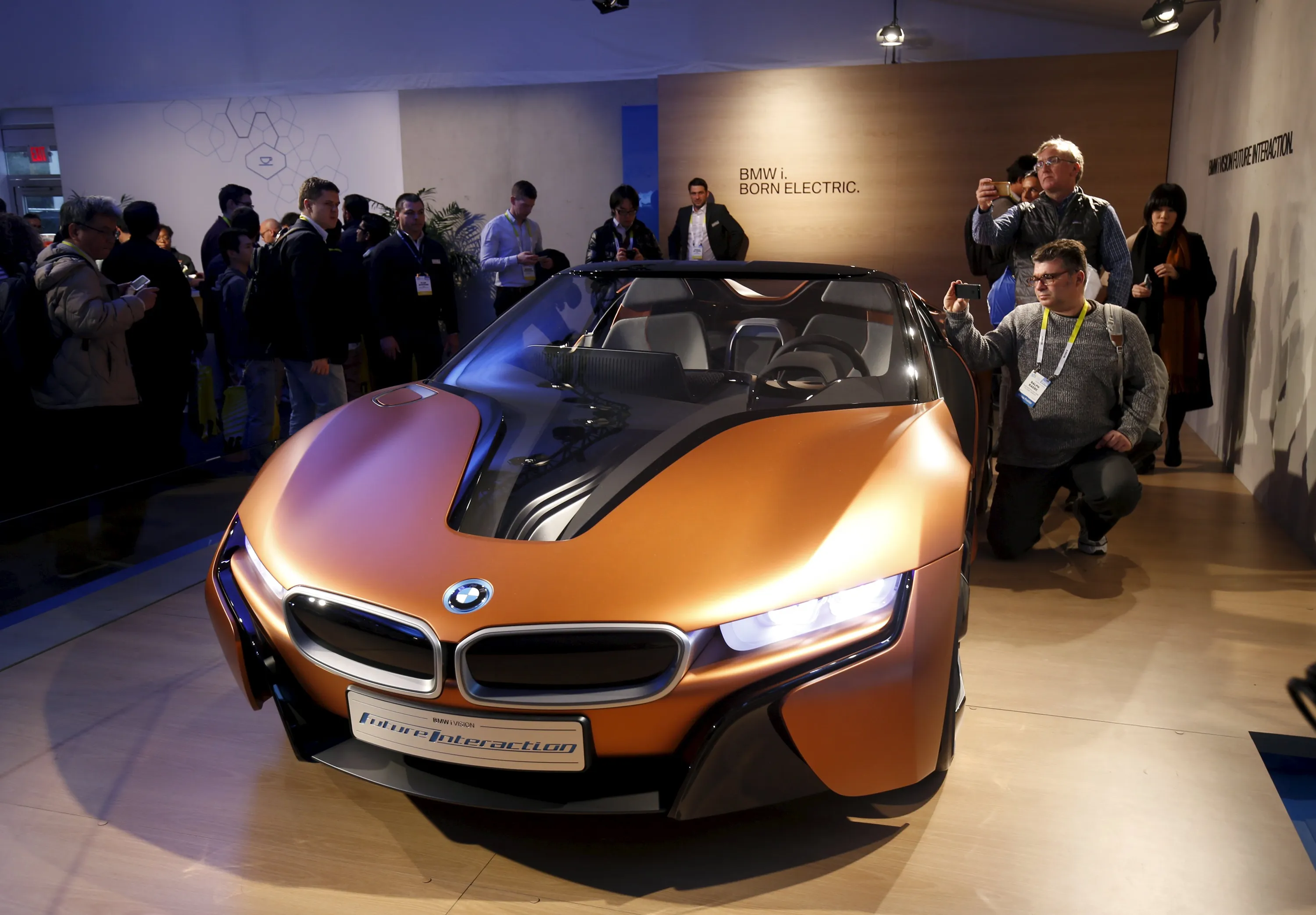 People look over the BMW i Vision Future Interaction concept car during the 2016 CES trade show in Las Vegas, Nevada January 7, 2016. The car includes BMW AirTouch technology that lets the driver control various functions with simple gestures. (Photo by Steve Marcus/Reuters)