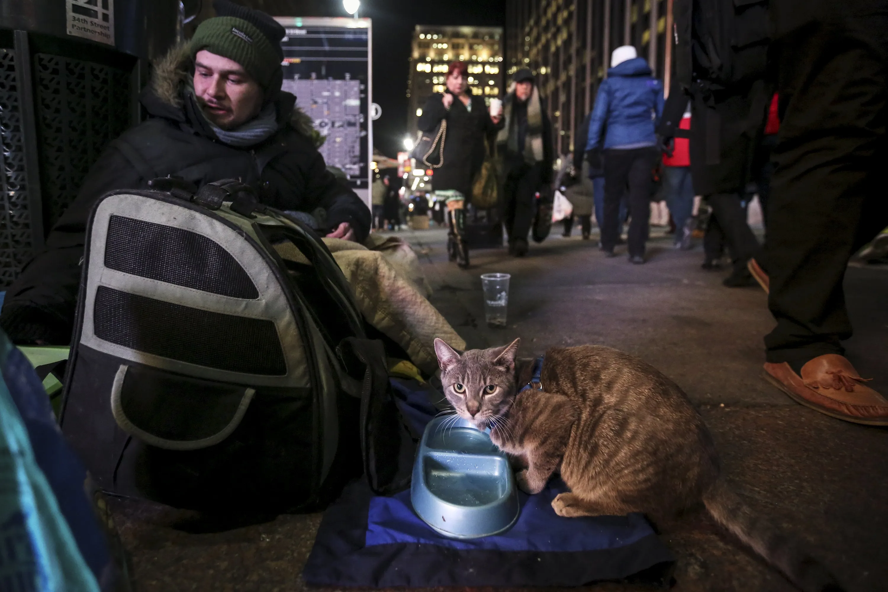 Keith Rosario sits with his cat Storm as he panhandles on the street outside Pennsylvania Station in the Manhattan borough of New York, January 5, 2016. (Photo by Carlo Allegri/Reuters)
