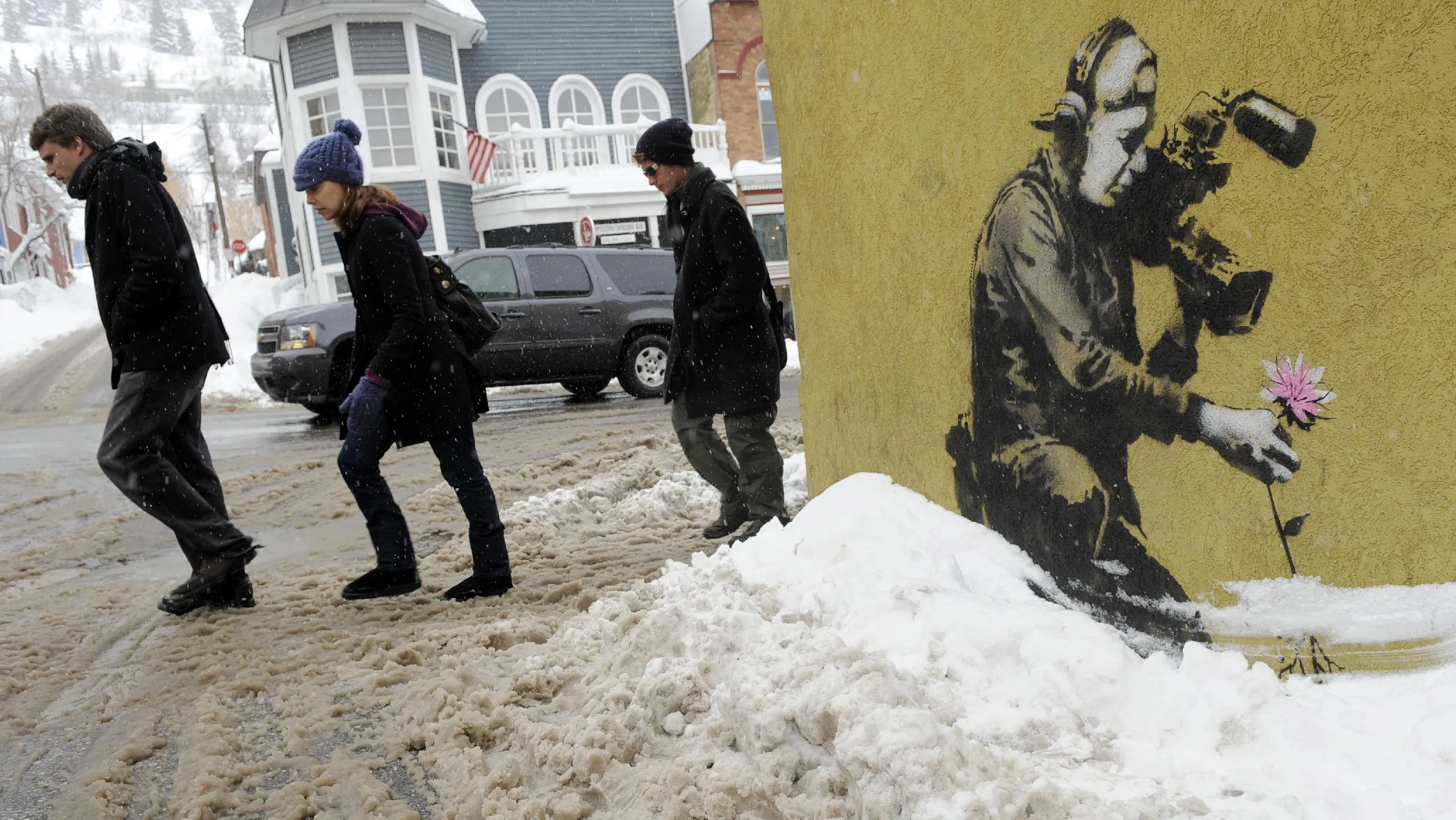 In this January 22, 2010 file photo, festivalgoers walk up Main Street past a design by graffiti artist Banksy during the Sundance Film Festival in Park City, Utah. The 2016 Sundance film festival runs from January 21-31. (Photo by Chris Pizzello/AP Photo)