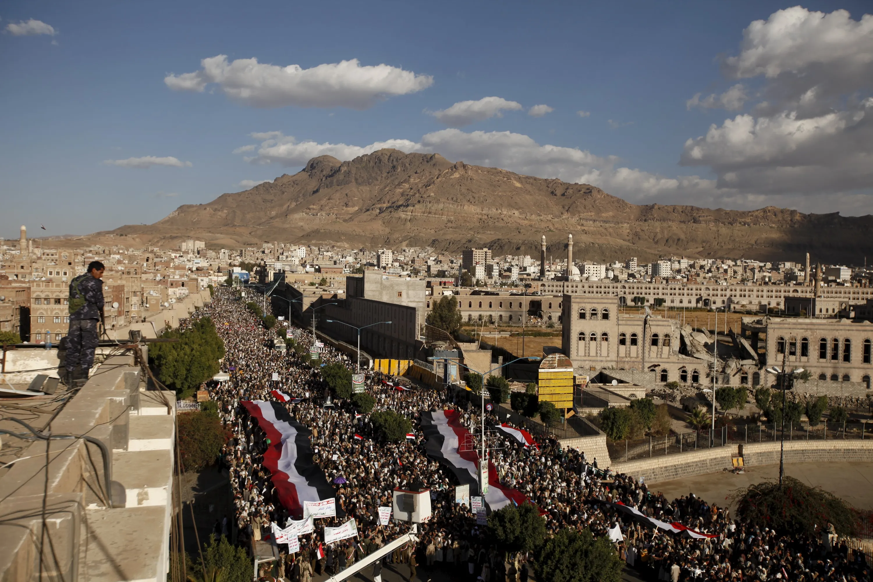 A Houthi militant stands guard as Houthi supporters demonstrate against Saudi-led air strikes in Yemen's capital Sanaa January 8, 2016. (Photo by Khaled Abdullah/Reuters)