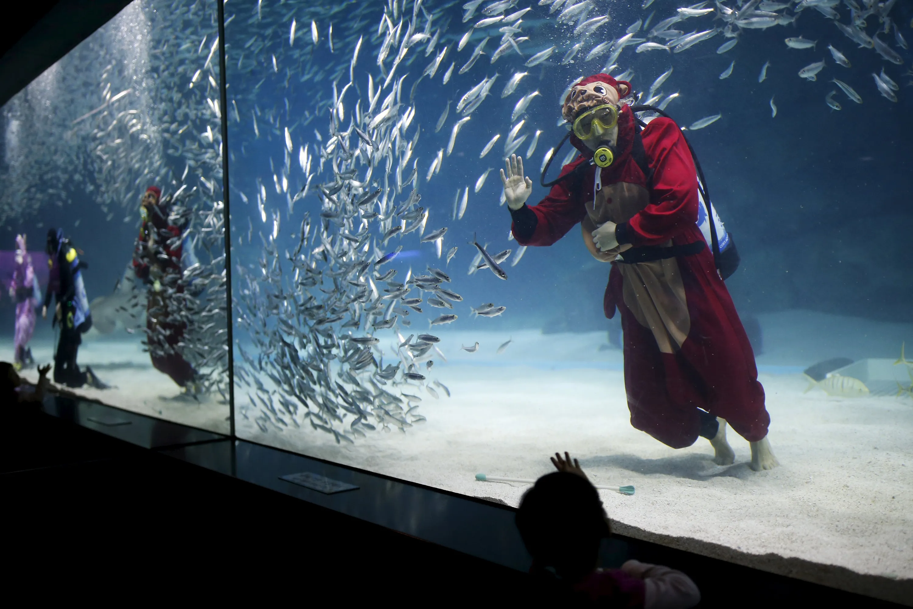 A diver dressed in a monkey costume featuring animal signs from the Chinese zodiac calendar, performs with sardines, in conjunction with Chinese Lunar New Year celebrations at an aquarium in Seoul, South Korea, January 12, 2016. (Photo by Kim Hong-Ji/Reuters)