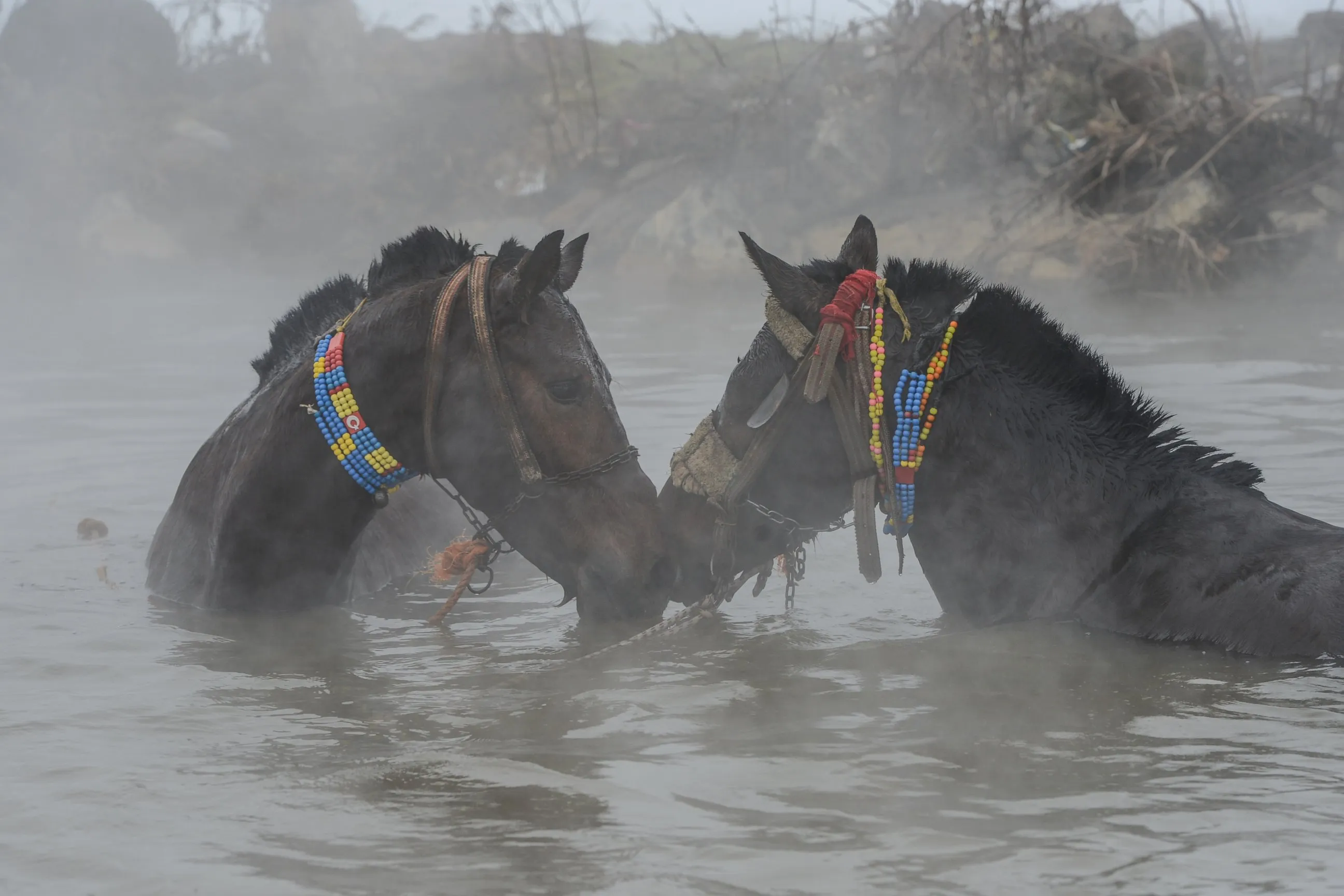 Horses are seen in a thermal spring in the village of Budakli in Guroymak district, Bitlis, Turkey, January 12, 2016. The springs are found in Budakli and are sought after by local and foreign tourists for their healing properties, especially in summer. Despite the freezing cold, the villagers bring their horses and water buffalo to the snow-covered springs. (Photo by Ibrahim Yakut/Anadolu Agency/Getty Images)