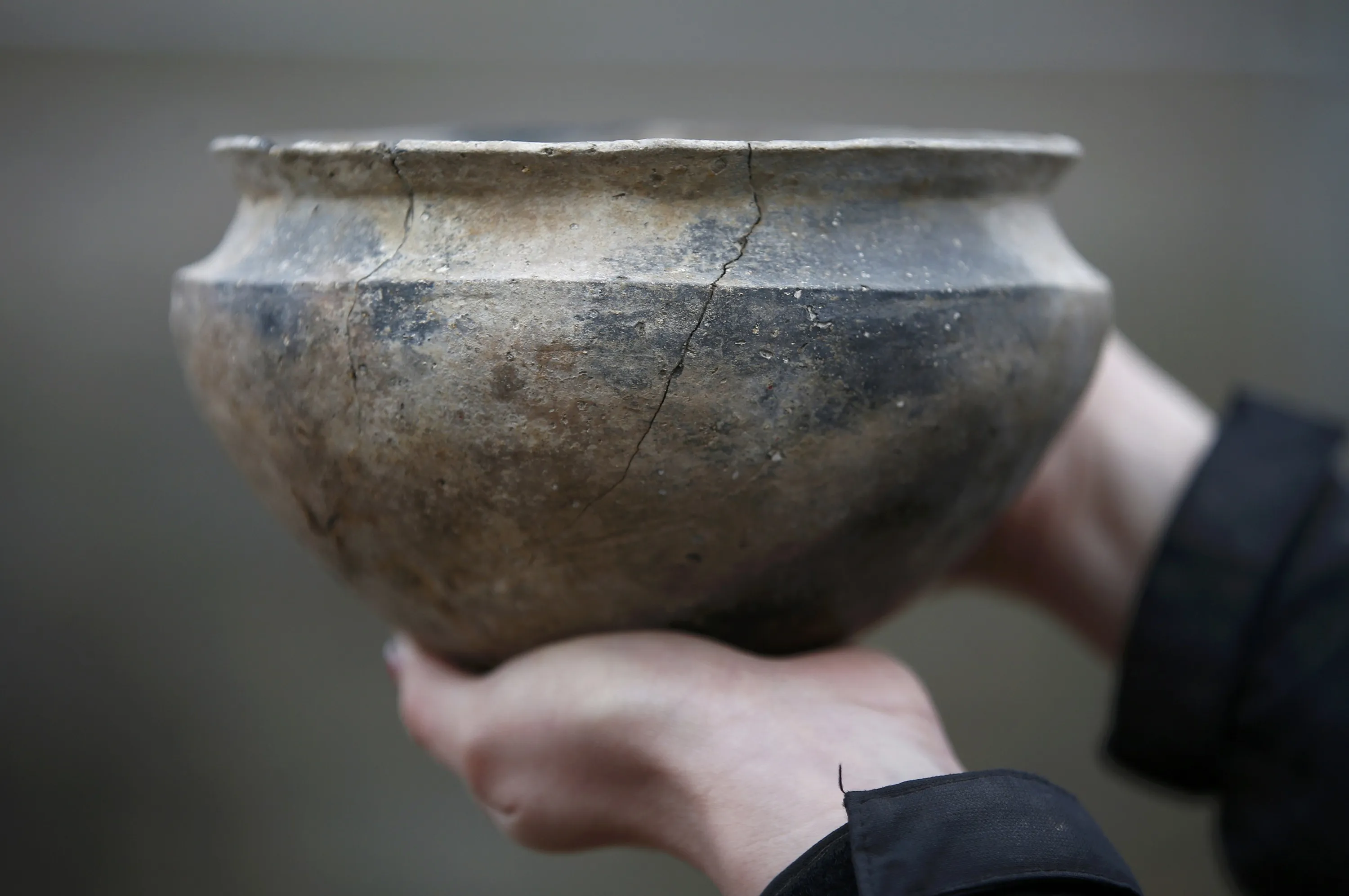 A clay pot discovered in 2006 by Archaeologists of the University of Cambridge Archaeological Unit, is displayed while they uncover Bronze Age wooden houses, preserved in silt, from a quarry near Peterborough, Britain, January 12, 2016. (Photo by Peter Nicholls/Reuters)