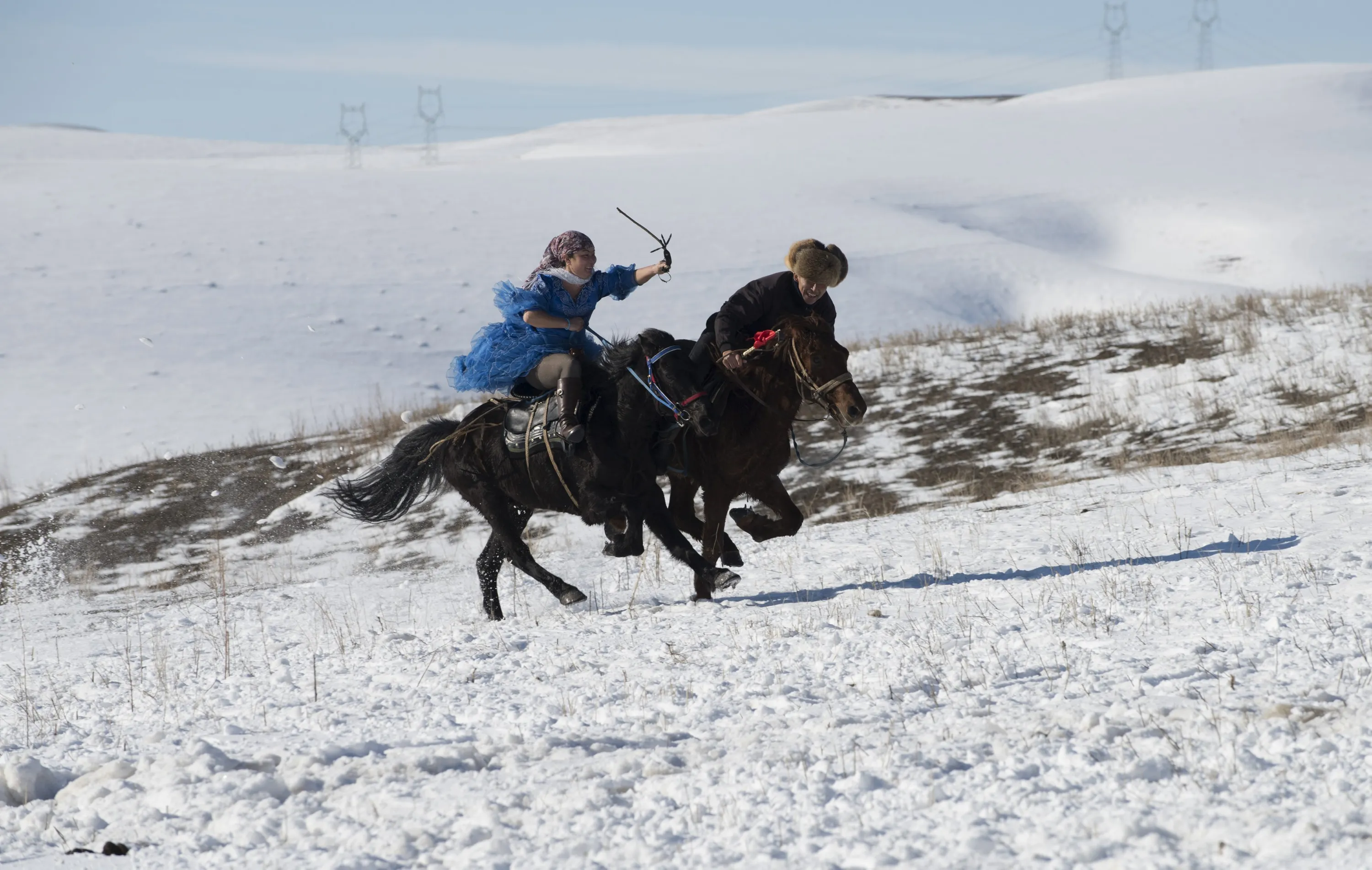 A Kazakh woman whips a male contestant as she defends herself during a Kyz Kuu (catch the girl) riding game at a winter festival in Yining, Xinjiang Autonomous Region, China, January 10, 2016. (Photo by Reuters/China Daily)