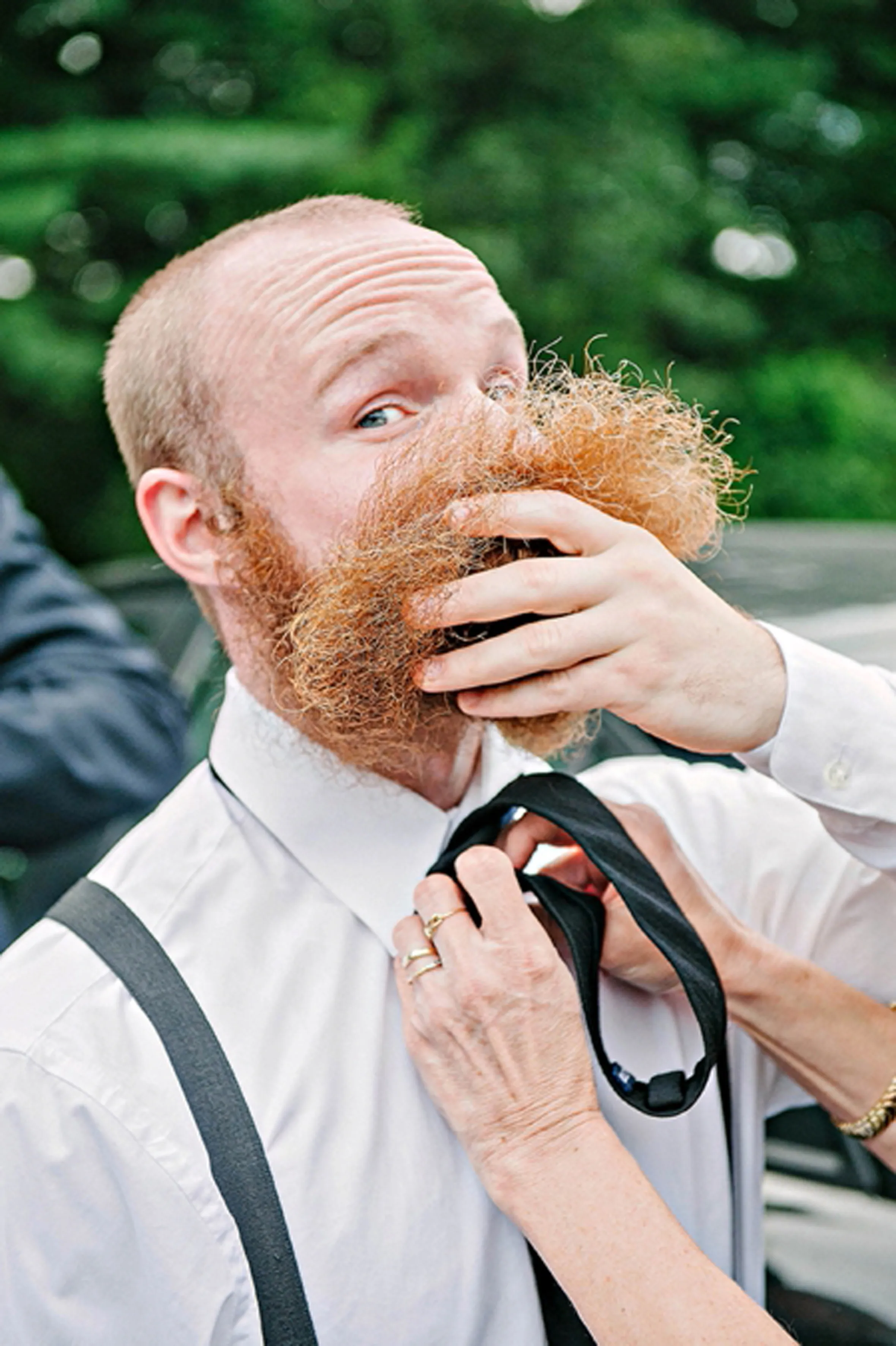 Man lifts beard to have his tie sorted. (Photo by Erica Ferrone/Caters News Agency/ISPWP)