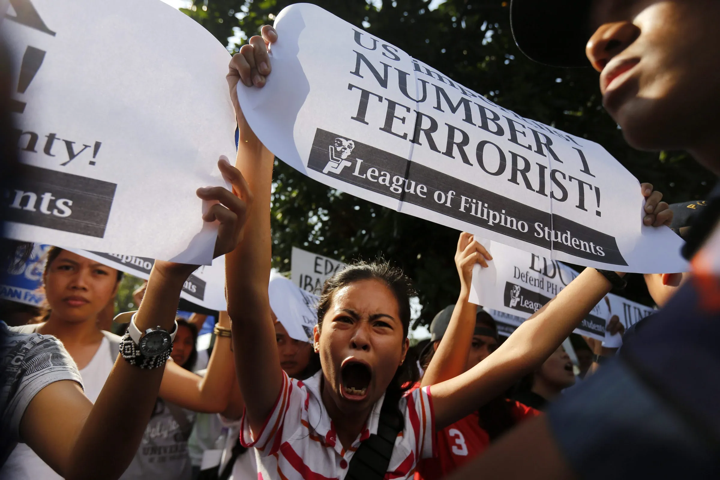 Filipino protestors stage a picket against the legality of the Enhanced Defense Cooperation Agreement (EDCA) in front of the US embassy in Manila, Philippines, 13 January 2016. An agreement allowing the increased presence of US military forces for training in the Philippines is constitutional, the South-East Asian country's Supreme Court decided. The decision came amid increasing tension between China and the Philippines over a territorial row in the South China Sea.