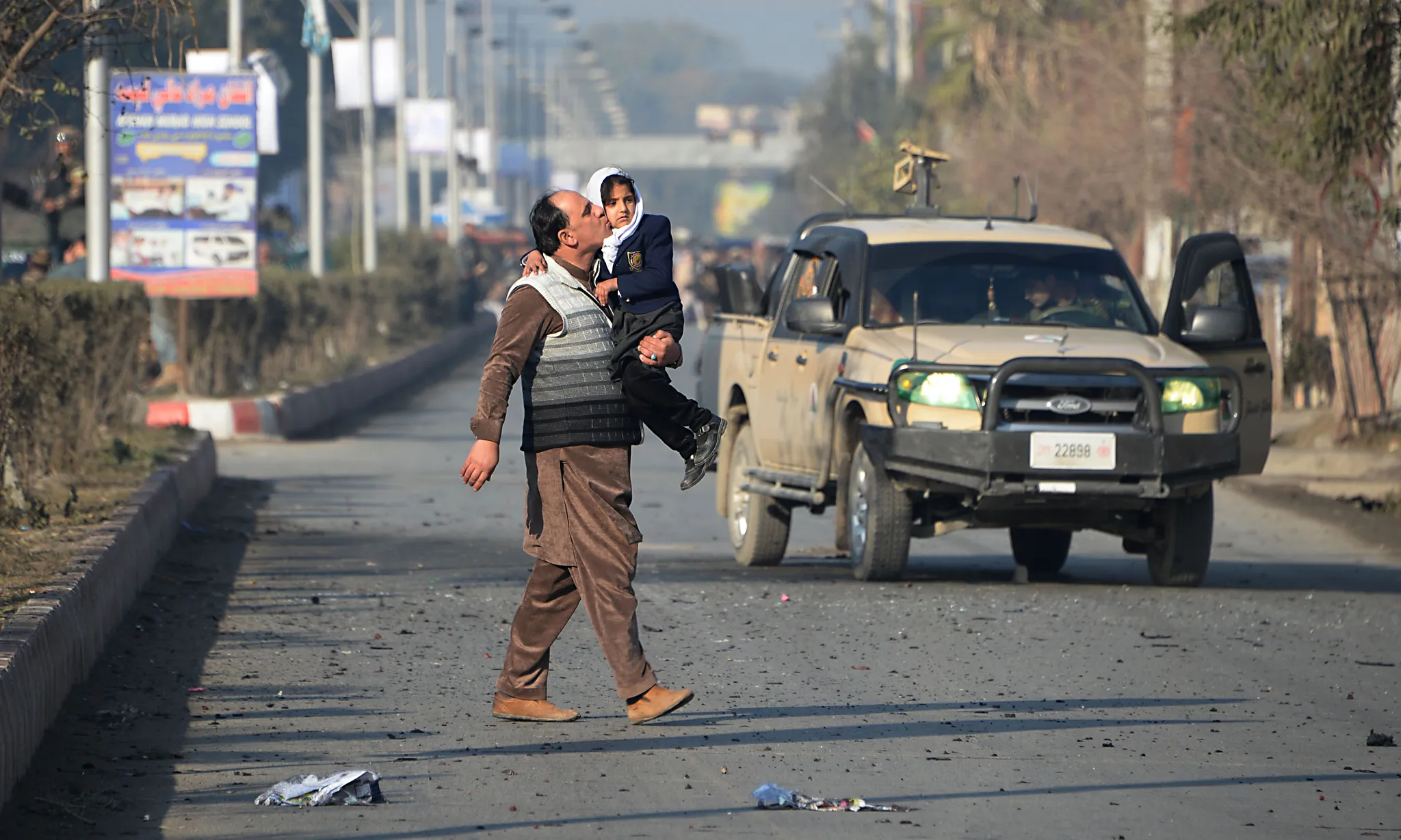 An Afghan man kisses his daughter as he walks near an attack from a building close to the Pakistan consulate in Jalalabad on January 13, 2016. (Photo by Noorullah Shirzada/AFP Photo)