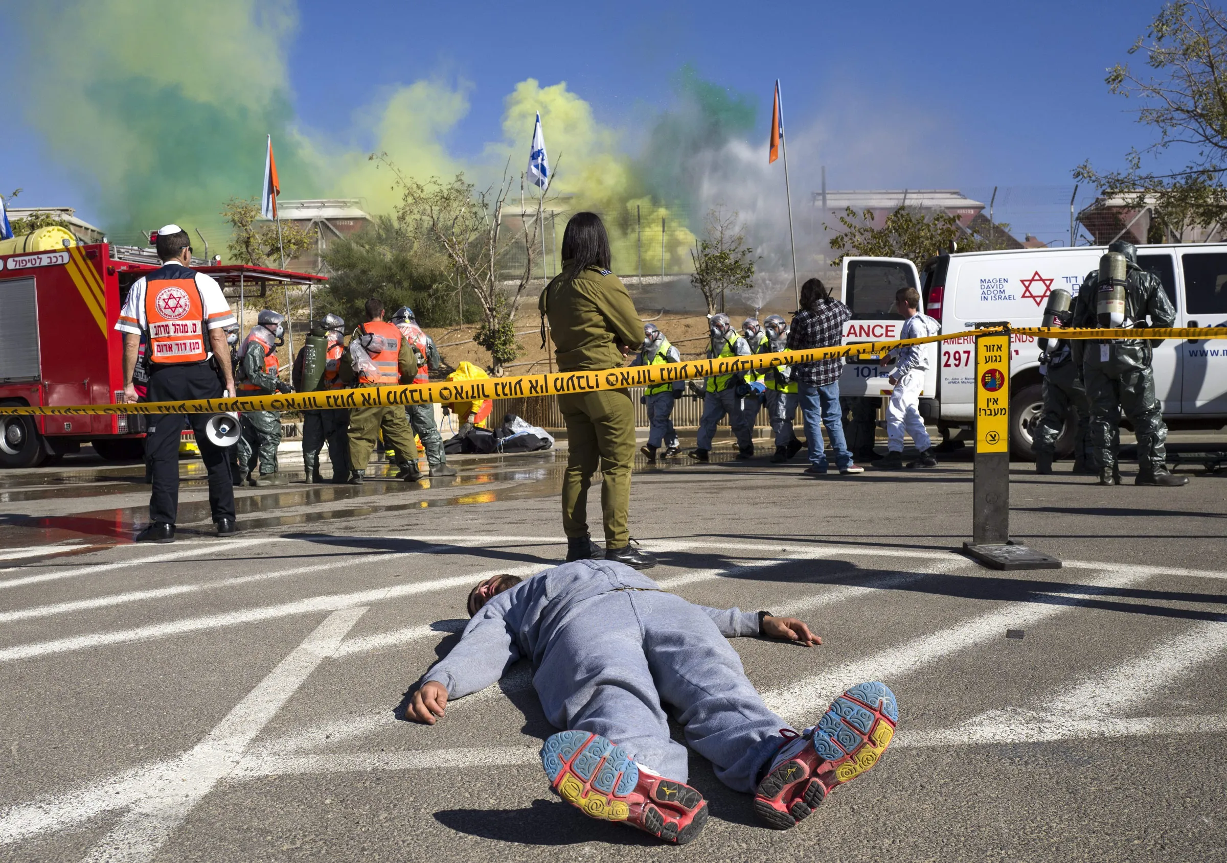 Israeli soldiers play the parts of wounded civilians during a drill simulating a toxic spill from an attack on a train in Beersheba, southern Israel, 13 January 2016, as Home Front medical teams, fire fighters and police carry out rescue operations. The large scale drill is the concluding exercise of the Fourth International Conference on Healthcare System Preparedness and Response to Emergencies and Disasters and includes some 200 of the world's experts on health system readiness from around the world. The conference is dealing with all types of medical emergencies from terrorist attacks to natural disasters. (Photo by Jim Hollander/EPA)