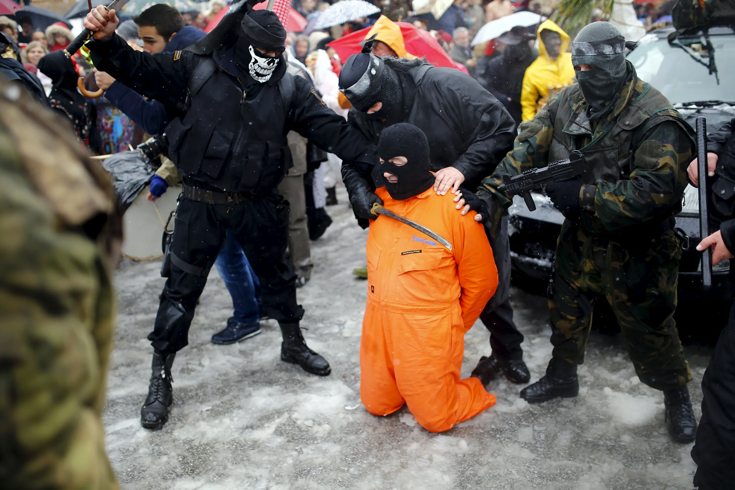 Revellers stage a satirical performance about Islamic State as they participate in a parade on the street during a carnival in the village of Vevcani, south of the Macedonian capital of Skopje, January 13, 2016. (Photo by Ognen Teofilovski/Reuters)