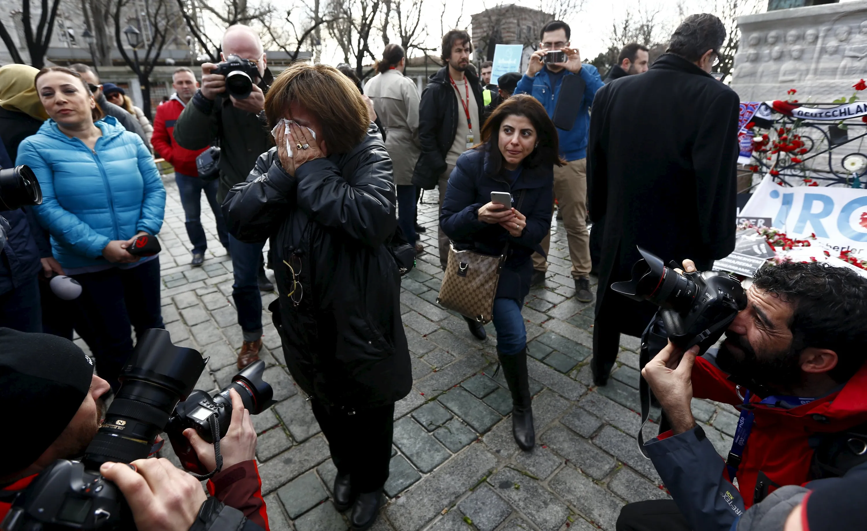 A tourist from Germany cries as she visits the site of Tuesday's suicide bomb attack at Sultanahmet square in Istanbul, Turkey January 14, 2016. (Photo by Murad Sezer/Reuters)