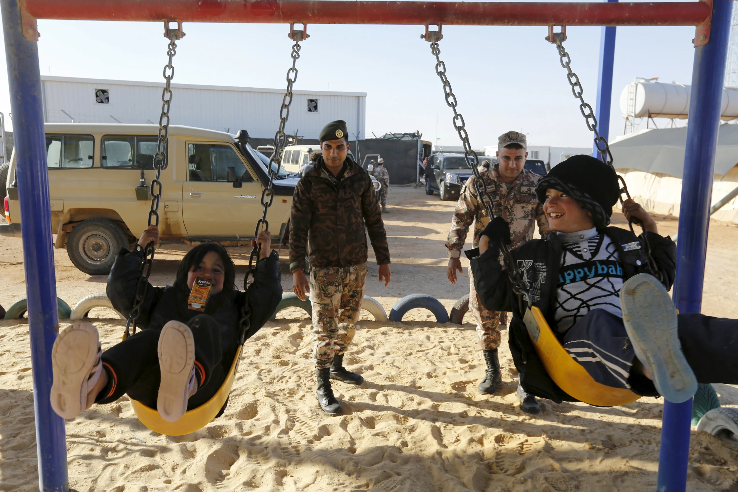 Jordanian solders play with Syrian refugee children after they crossed into Jordanian territory with their families, near the town of Ruwaished, at the Hadalat area, east of the capital Amman, January 14, 2016. After months of being stranded at the border, a group of Syrian refugees has finally been allowed to enter Jordan. Jordanian authorities say they have to address security concerns before allowing more refugees into the country burdened with over 1.4 million refugees, said the commander of Jordan's border guard force, Brigadier General Saber Mahayrah. (Photo by Muhammad Hamed/Reuters)