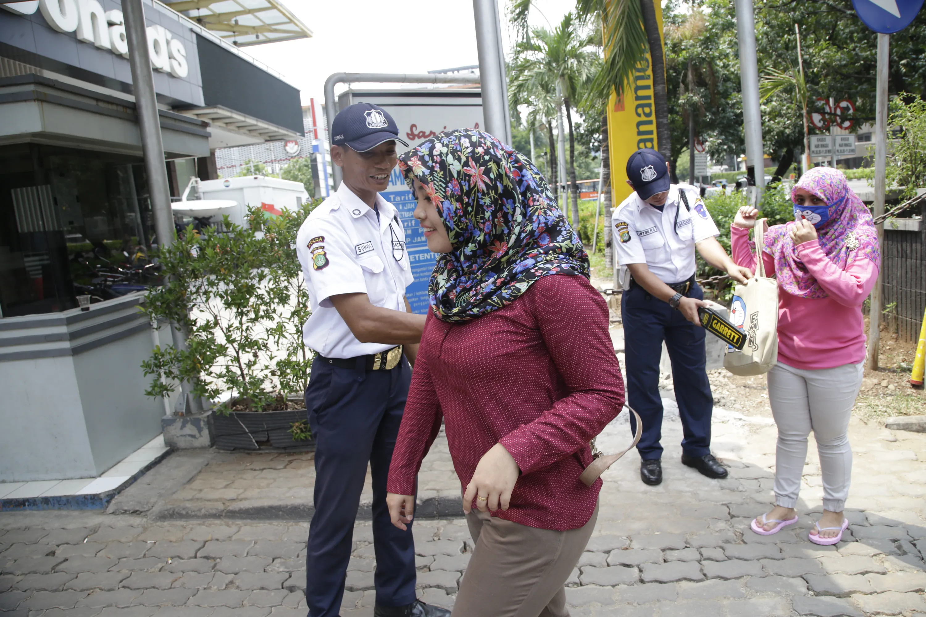 Security guards check the bags of pedestrians outside of a McDonald's restaurant across the street from the Starbucks cafe where Thursday's attack occurred in Jakarta, Indonesia, Friday, January 15, 2016. (Photo by Tatan Syuflana/AP Photo)