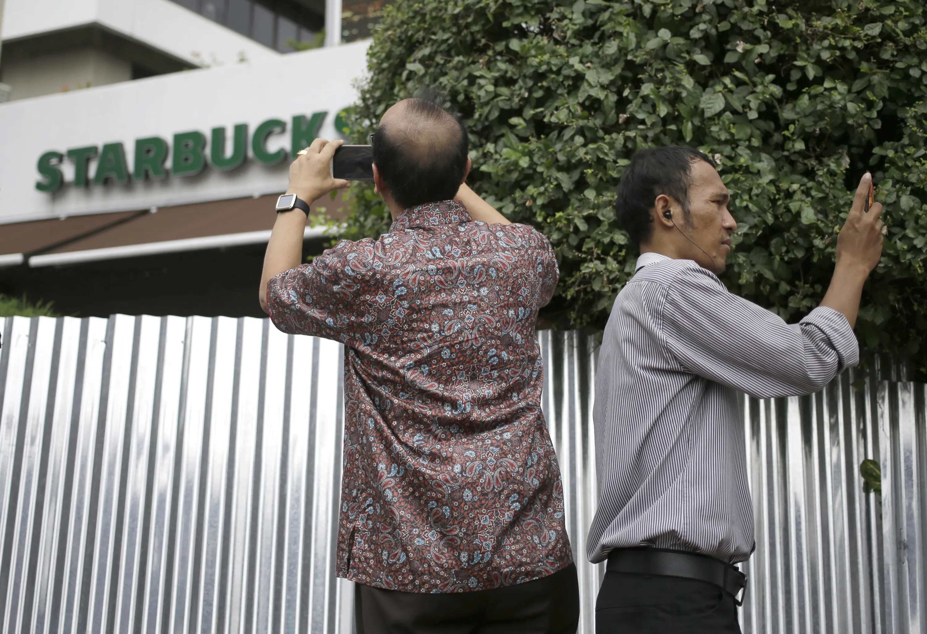 Indonesian men uses their mobile phones to take pictures outside the Starbucks cafe where Thursday's attack occurred in Jakarta, Indonesia, on Friday, January 15, 2016. (Photo by Dita Alangkara/AP Photo)