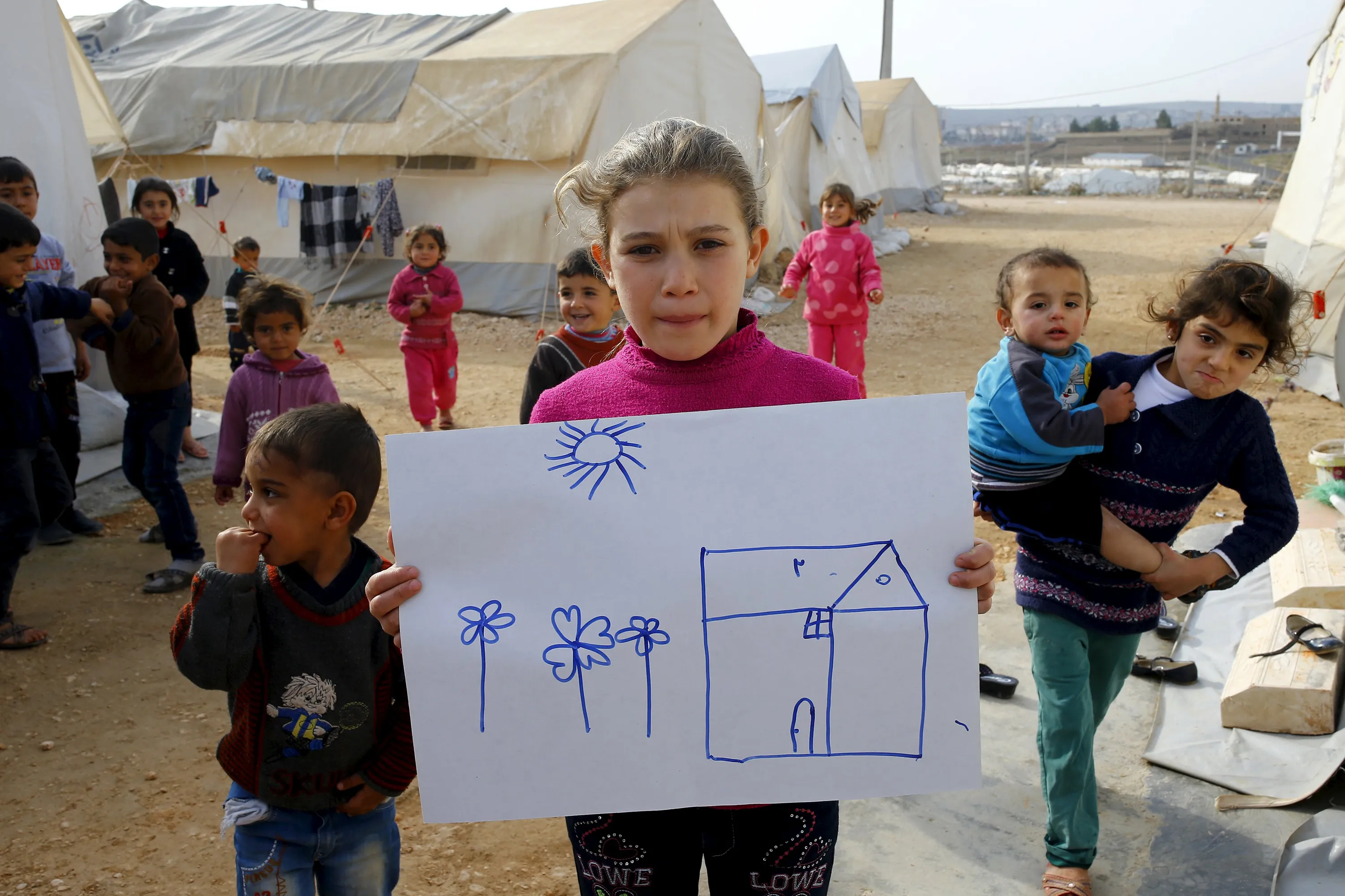 Syrian refugee girl Rahaf Hasan, 10, poses as she holds a drawing of her home in Syria in Midyat refugee camp in Mardin province, Turkey, December 14, 2015. (Photo by Umit Bektas/Reuters)
