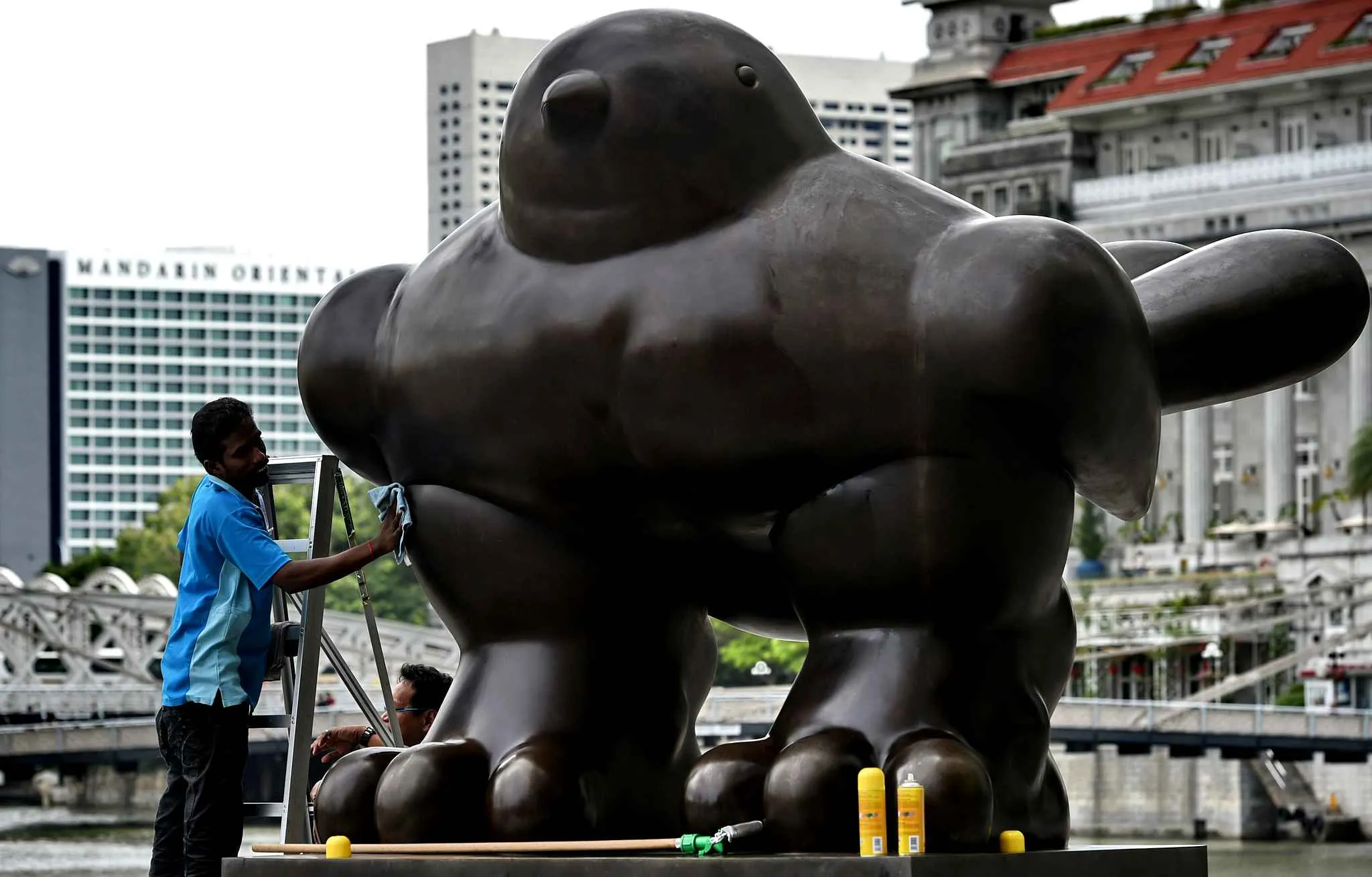 A worker polishes a bronze statue of a bird along the river quay next to the financial business district in Singapore on January 15, 2016. (Photo by Roslan Rahman/AFP Photo)