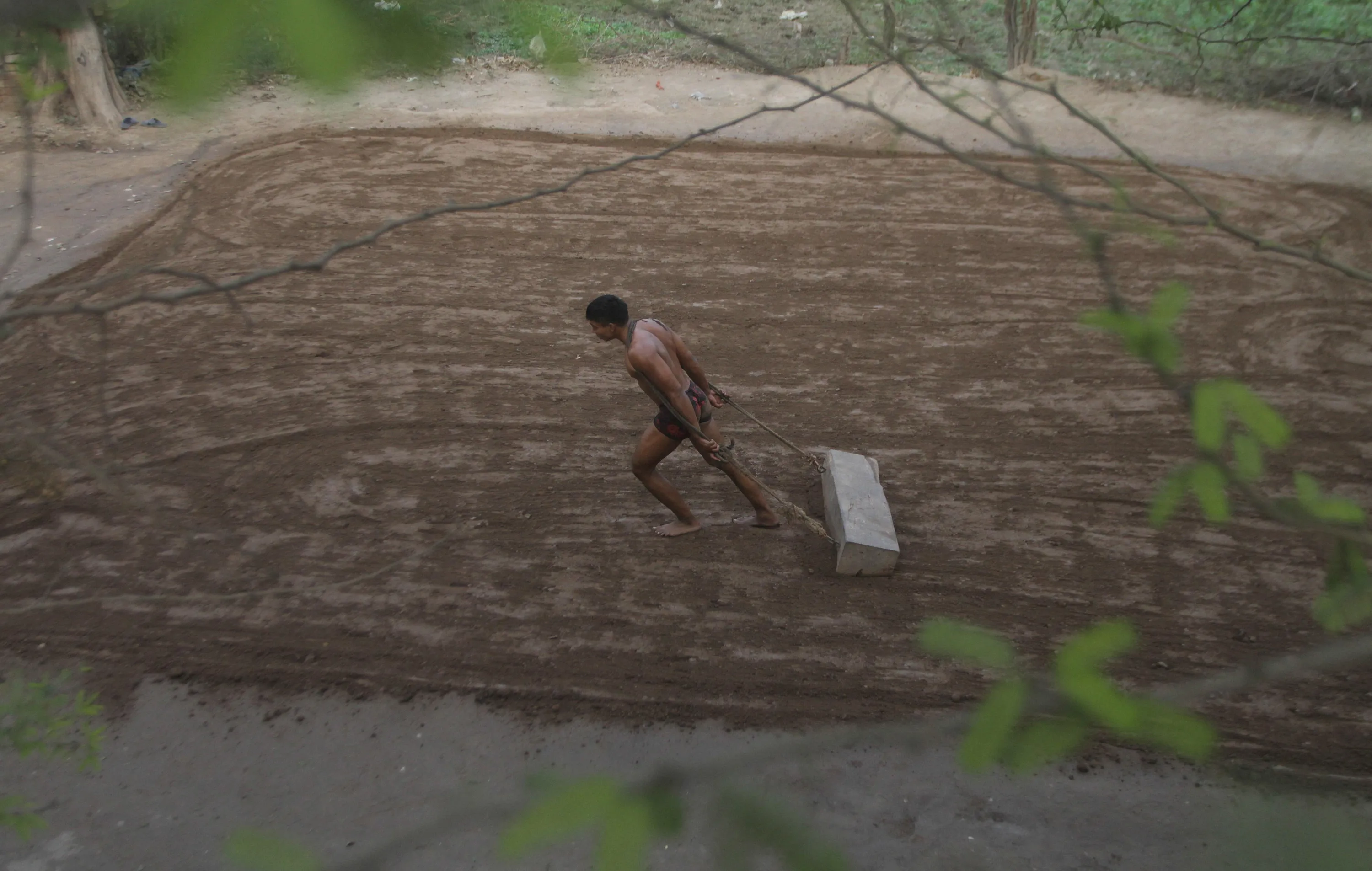 A Pakistani Kushti wrestler prepares the ground in the ring for a training session, in Lahore, Pakistan, Tuesday, January 5, 2016. Kushti, an Indo-Pakistani form of wrestling, is several thousand years old and is a national sport in Pakistan. (Photo by K.M. Chaudary/AP Photo)