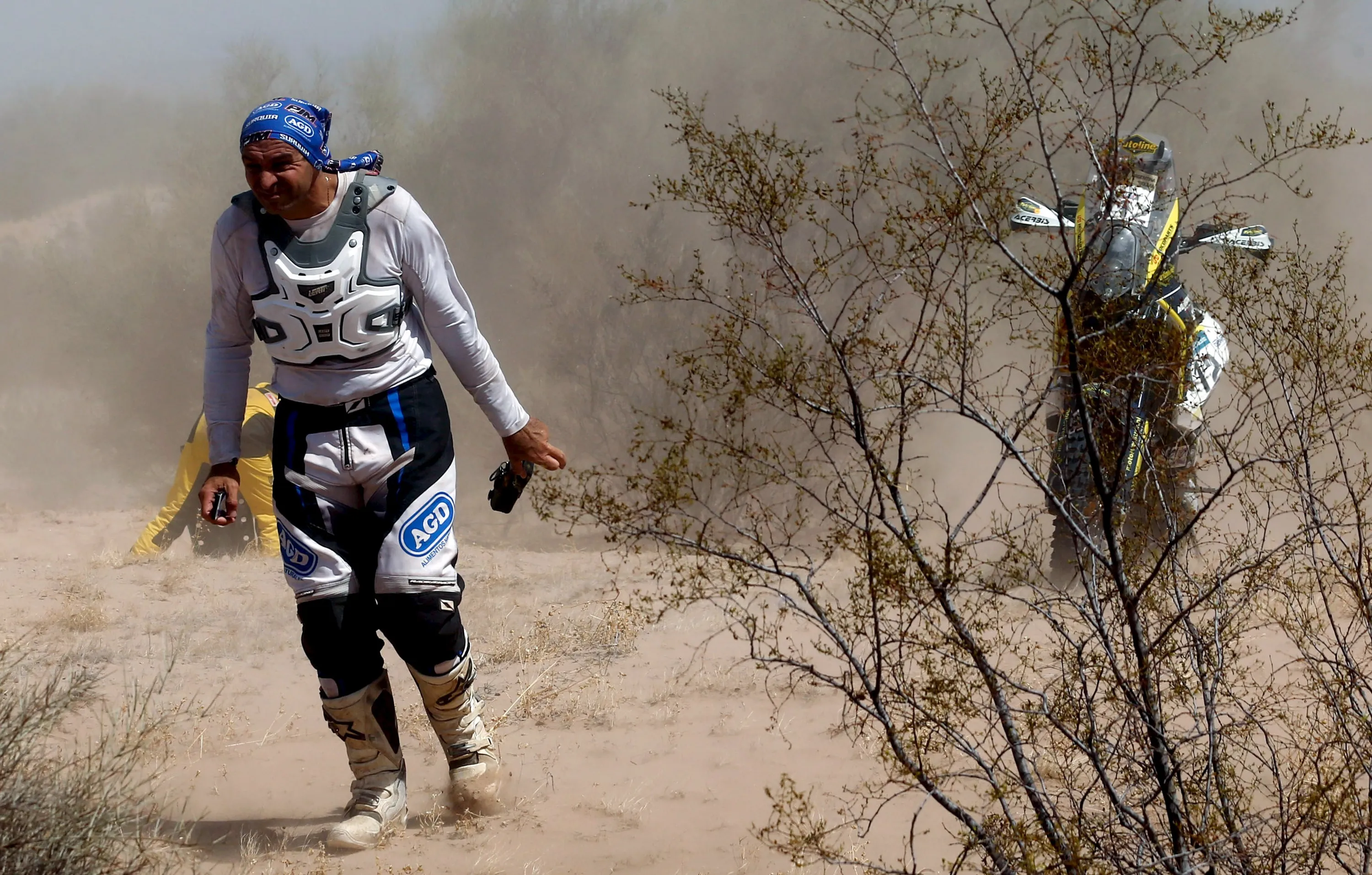 Yamaha rider Alberto Sebastian Urquia of Argentina walks before being picked up by an assistance helicopter and leaving his motorcycle on the road during the ninth stage of the Dakar Rally 2016 near Belen, Argentina, January 12, 2016. The Husqvarna motorcycle on the right belongs to Hans Smit of Netherlands, who was also taken back to the bivouac on a helicopter. (Photo by Marcos Brindicci/Reuters)