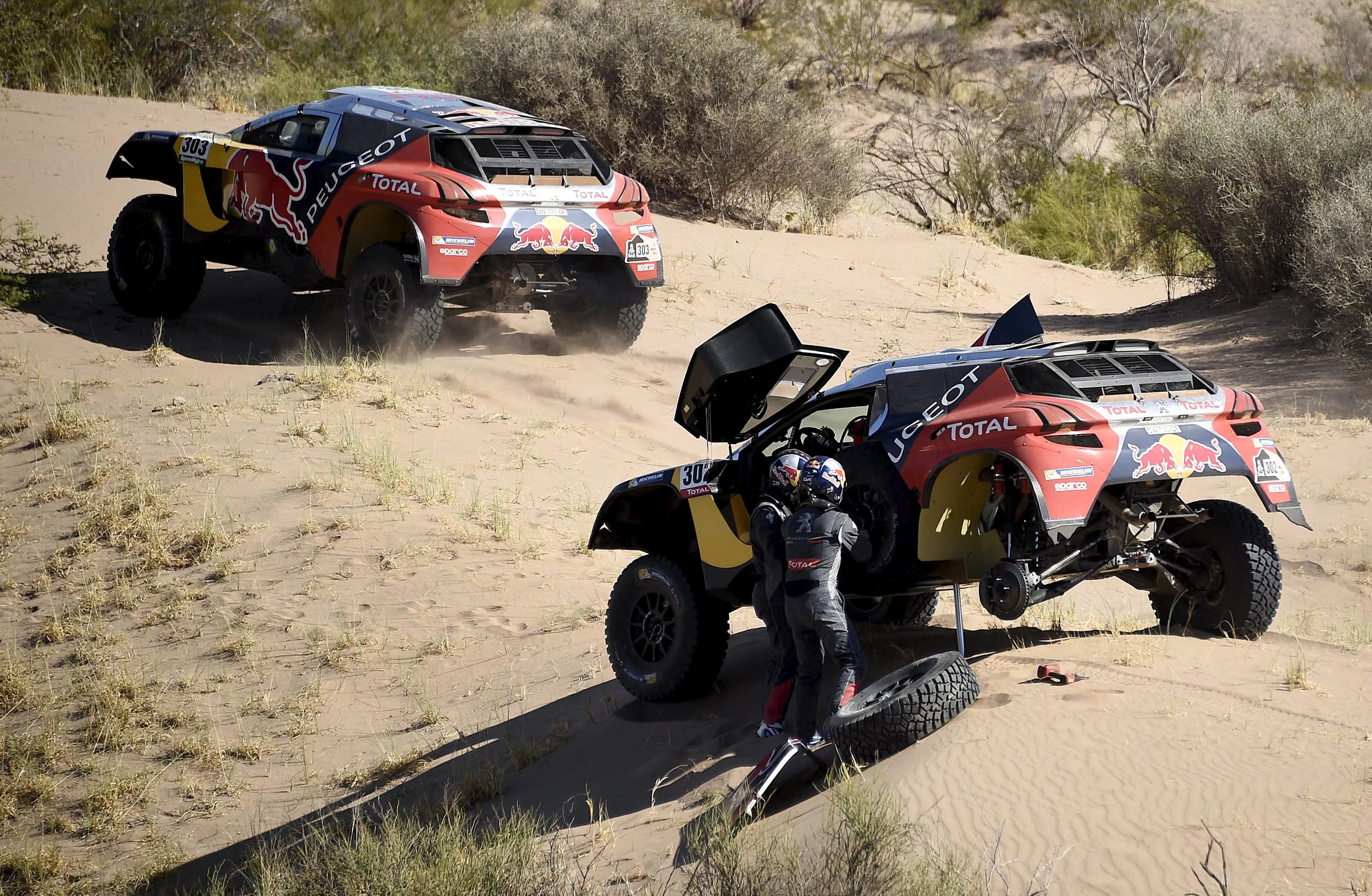 Stephane Peterhansel (L) of France and co-pilot Jean Paul Cottret change a tire of their Peugeot as Carlos Sainz of Spain drives his Peugeot past them during the ninth stage of the Dakar Rally 2016 near Belen, Argentina, January 12, 2016. (Photo by Franck Fife/Reuters)