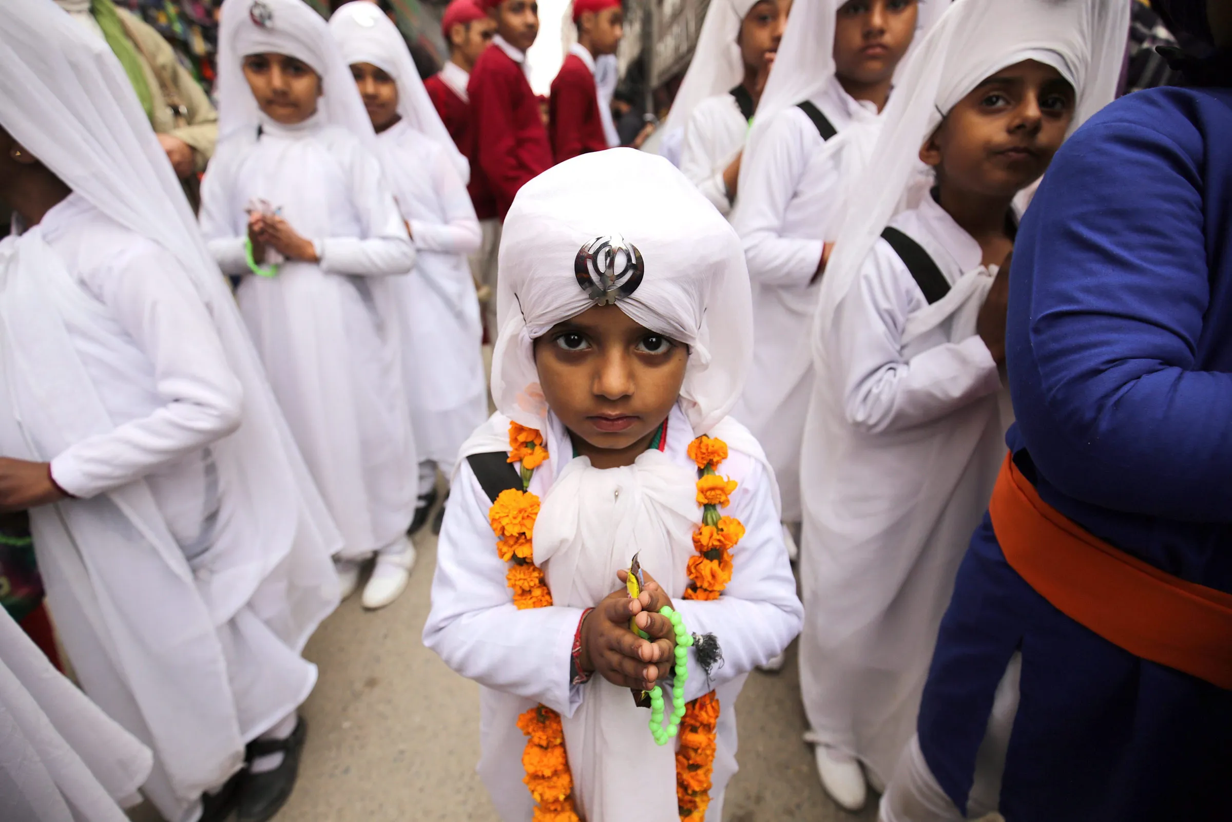 Indian children, wearing religious attire, take part in a religious procession on the eve of the 351st birth anniversary of the tenth Guru or master of the Sikhs, Sri Guru Gobind Singh in Amritsar, India, 15 January 2016. Guru Gobind Singh Ji was the tenth Sikh Guru who initiated the special order or sect of the Sikhs called the Khalsa Panth. (Photo by Raminder Pal Singh/EPA)