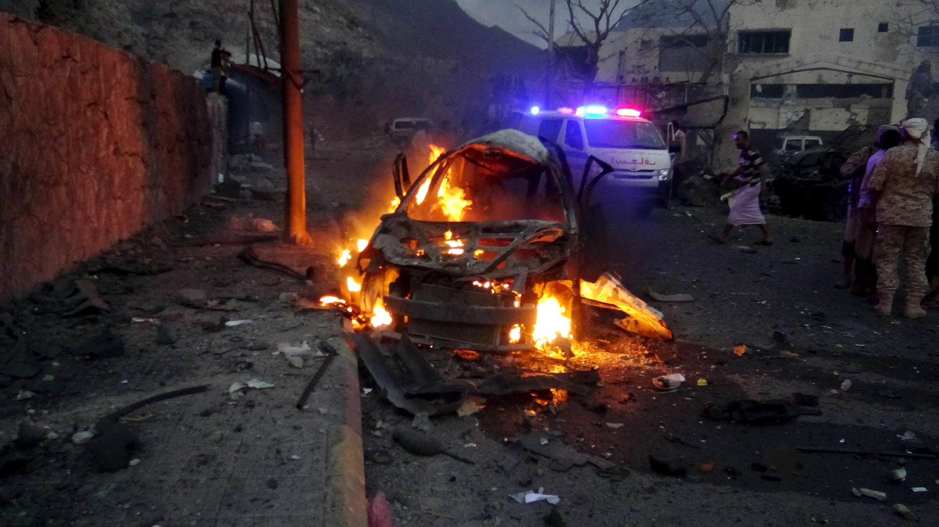A car burns at the site of a car bomb attack outside the house of the director of security for Yemen's southern port city of Aden, Brigadier General Shalal Ali Shayyeh, in Aden January 17, 2016. (Photo by Reuters/Stringer)