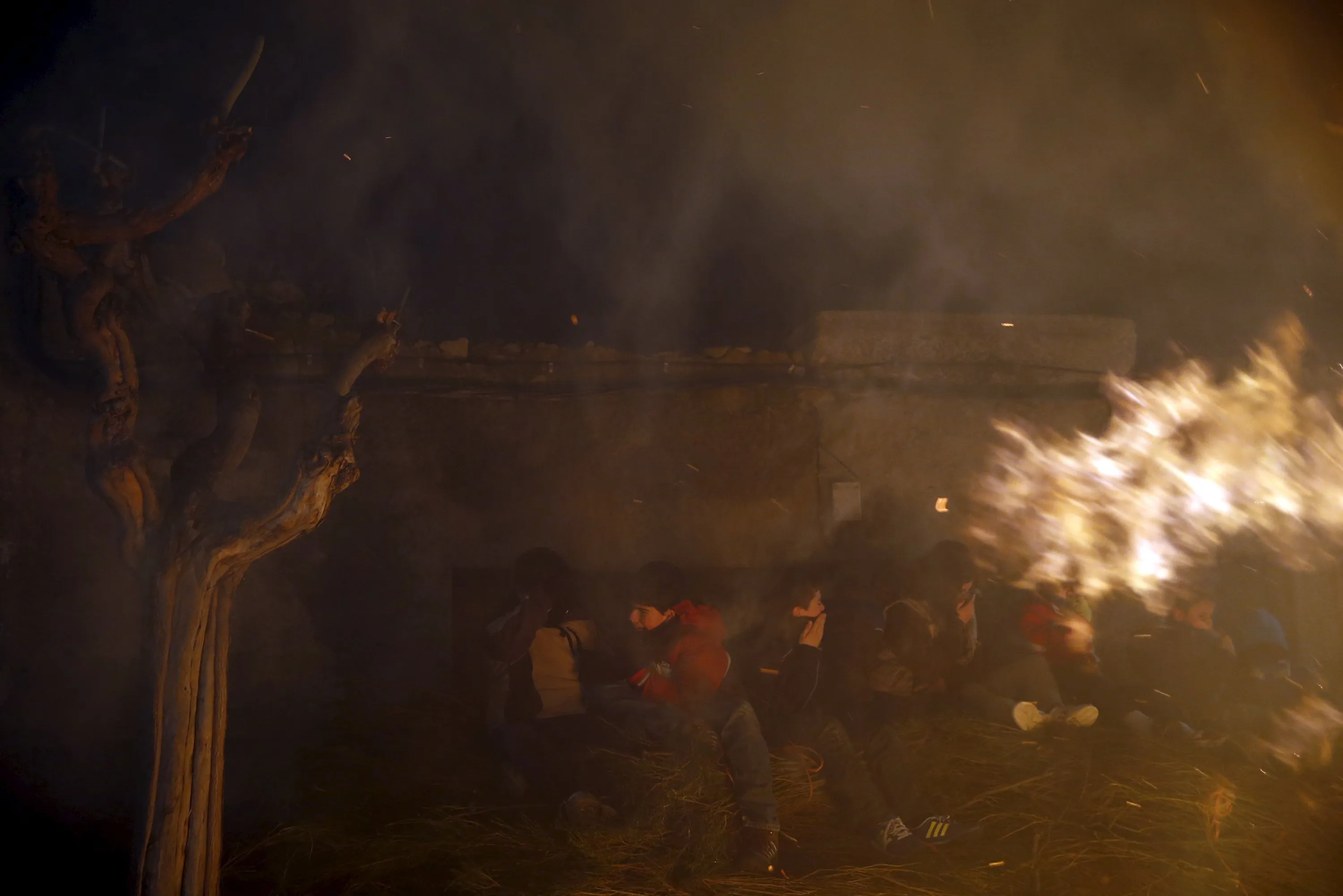 Children try to protect themselves from the flames of a bonfire during the “Luminarias” annual religious celebration on the eve of Saint Anthony's day, Spain's patron saint of animals, in the village of San Bartolome de Pinares, northwest of Madrid, Spain, January 16, 2016. (Photo by Susana Vera/Reuters)