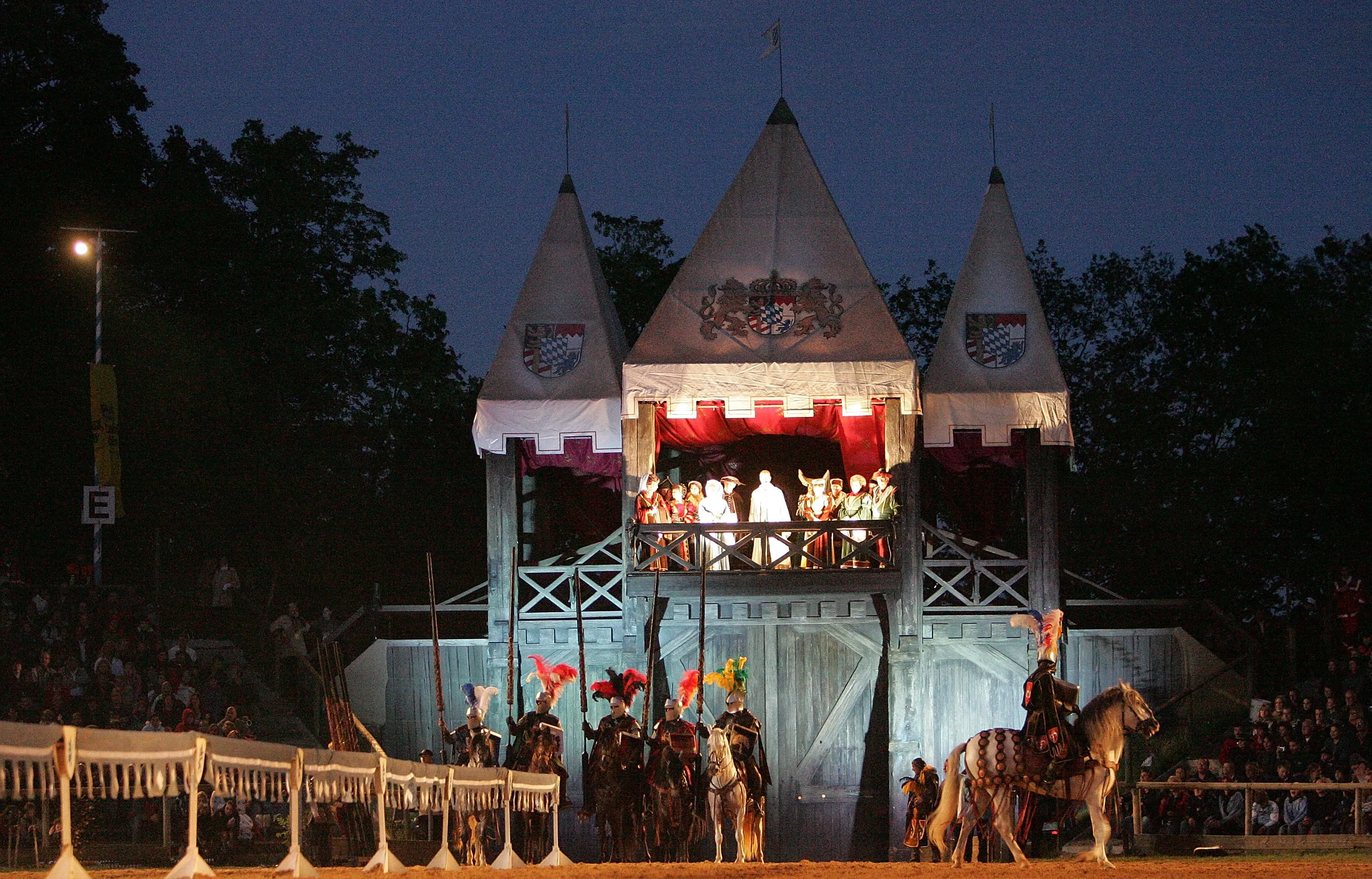 KALTENBERG, GERMANY - JULY 08: Actors dressed as knights perform during the traditional Kaltenberg knight tournament on July 8, 2007 in Kaltenberg, Germany. With around 120,000 visitors each year, the festival including knight tournaments, medieval styled markets and a variety of music performances, the event is one of the biggest of its kind. (Photo by Johannes Simon/Getty Images)