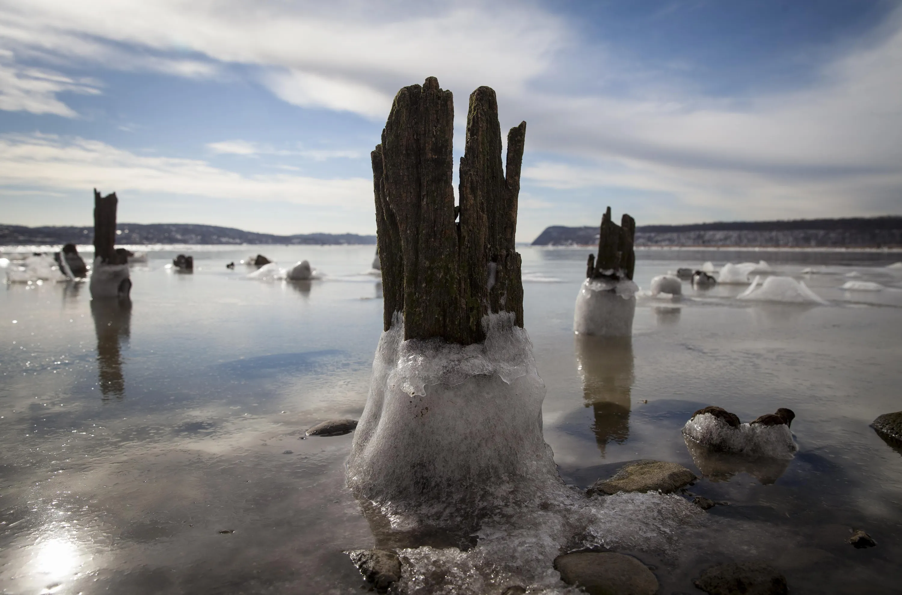 A thick layer of ice covers rotting pilings, in this view of the frozen Hudson River looking south towards the Palisades cliffs (right) as seen from the New York City river town suburb of Piermont, February 6, 2015. The New York region was gripped by bitter cold temperatures again Friday as another round of snow was forecast to move into the northeast United States over the weekend, according to local reports. (Photo by Mike Segar/Reuters)