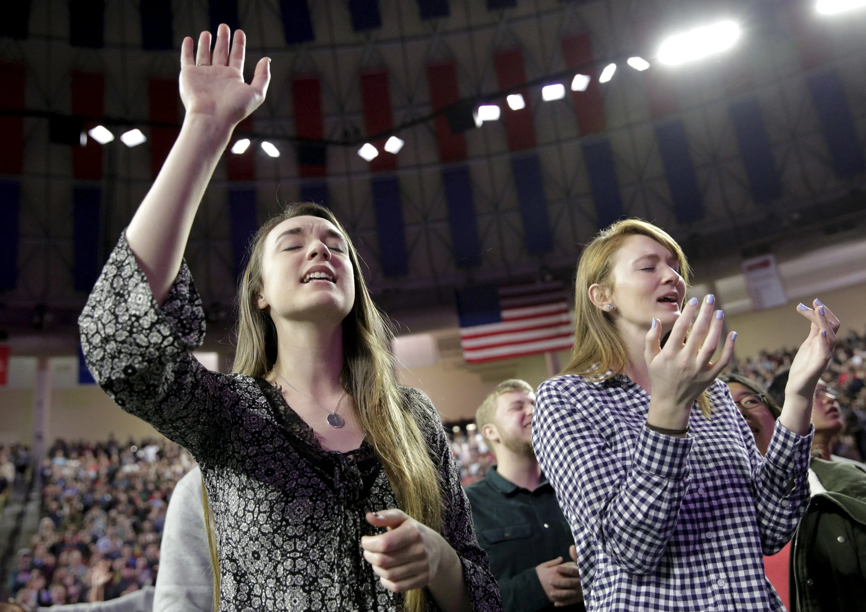 Lesley Chambers (L) of Champaign, Illinois and Brensley Baker of San Francisco, California, hold their hands up as they sing before U.S. Republican presidential candidate Donald Trump arrival at Liberty University in Lynchburg, Virginia, January 18, 2016. (Photo by Joshua Roberts/Reuters)
