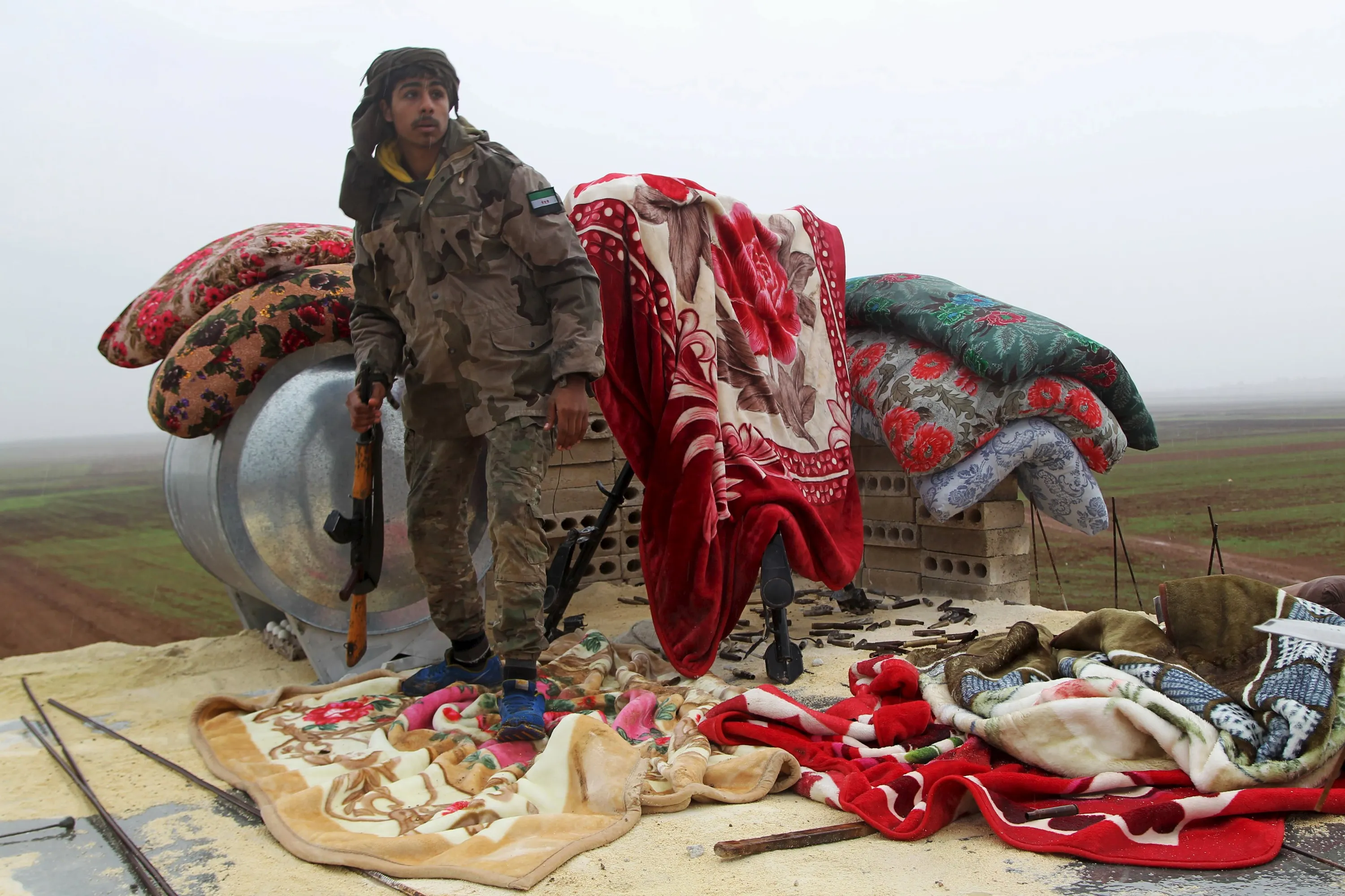 A Free Syrian Army fighter stands on a lookout point in the northern Aleppo countryside, Syria, January 18, 2016. The Sultan Murad brigade, part of the Free Syrian Army, with the help of air strikes carried out by the U.S.-led coalition, took control of the Hur-klas, Ghazal and Yan-yaban villages on the border with Turkey, from Islamic State fighters, in the northern Aleppo countryside, activists said. (Photo by Abdelrahmin Ismail/Reuters)