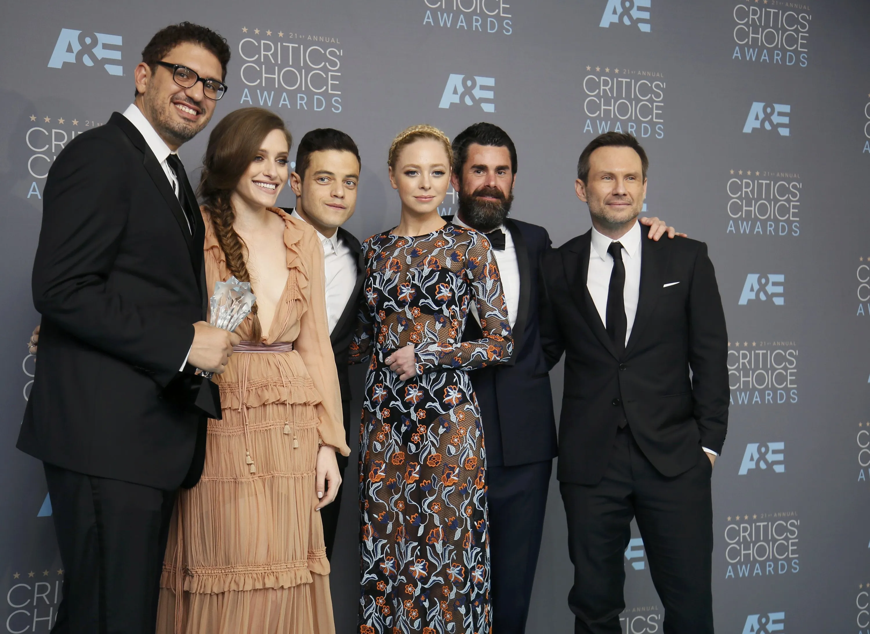 Producer Sam Esmail (L) and cast pose backstage with award for Best Drama Series for “Mr. Robot” at the 21st Annual Critics' Choice Awards in Santa Monica, California January 17, 2016. (Photo by Danny Moloshok/Reuters)