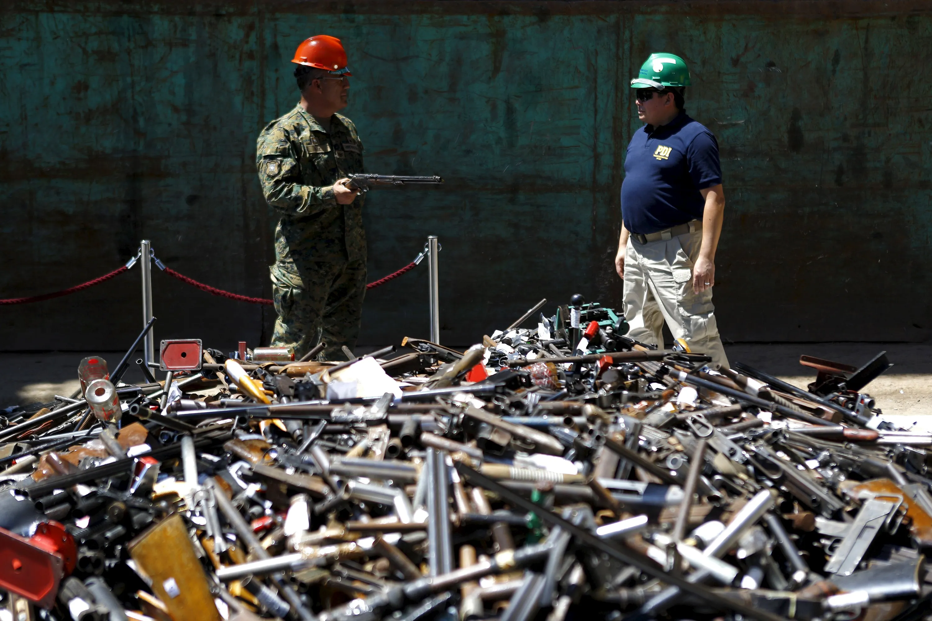 An army member inspects a weapon as he talks to a policeman in front of a pile of confiscated weapons before being destroyed at a foundry in Santiago, Chile, January 18, 2016. (Photo by Ivan Alvarado/Reuters)