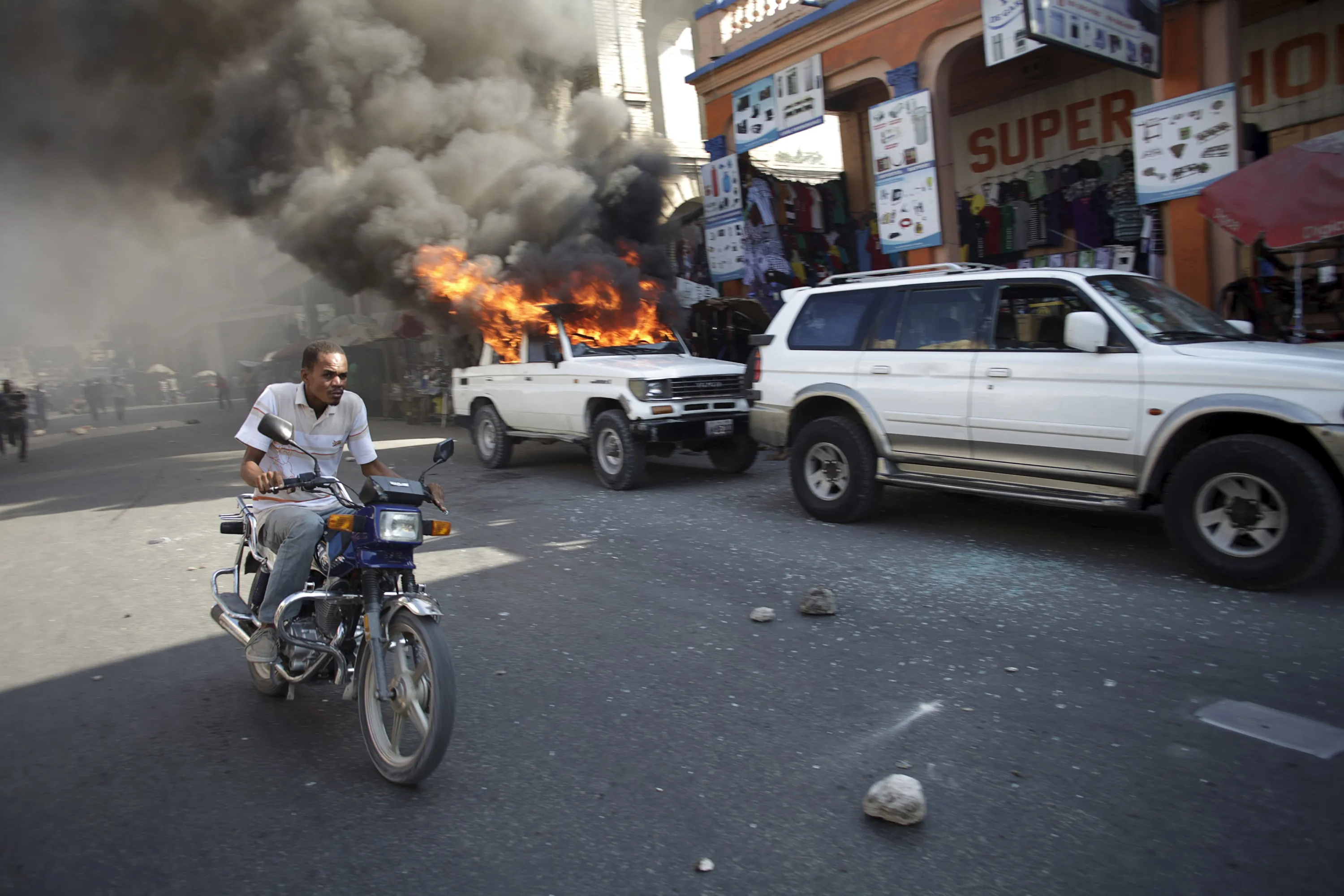 A man riding a bike passes next to a car that was set afire by protesters during a demonstration against the electoral process in Port-au-Prince, Haiti, January 18, 2016. Haiti's delayed presidential run-off election will take place on January 24. (Photo by Andres Martinez Casares/Reuters)