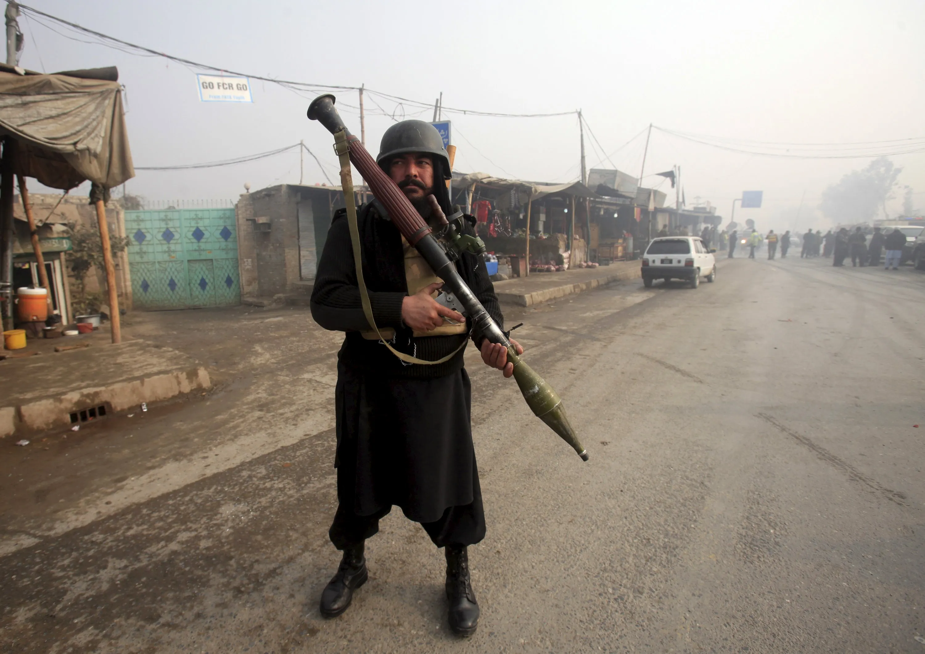 An armed paramilitary soldier stands guard after a suicide bomber blew himself up close to a police checkpoint in Peshawar, Pakistan January 19, 2016. (Photo by Fayaz Aziz/Reuters)