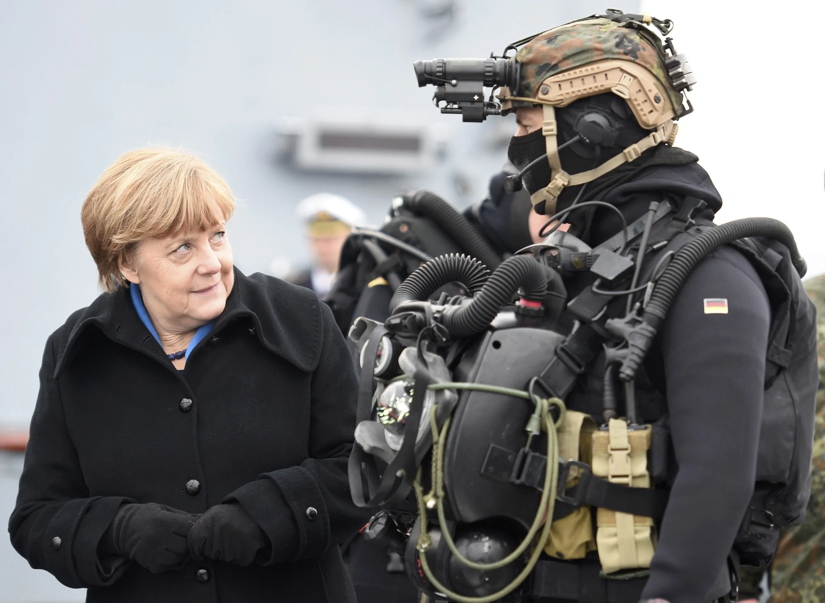 German Chancellor Angela Merkel looks at a combat diver during her visit to Naval Base Command in Kiel, Germany, January 19, 2016. (Photo by Fabian Bimmer/Reuters)