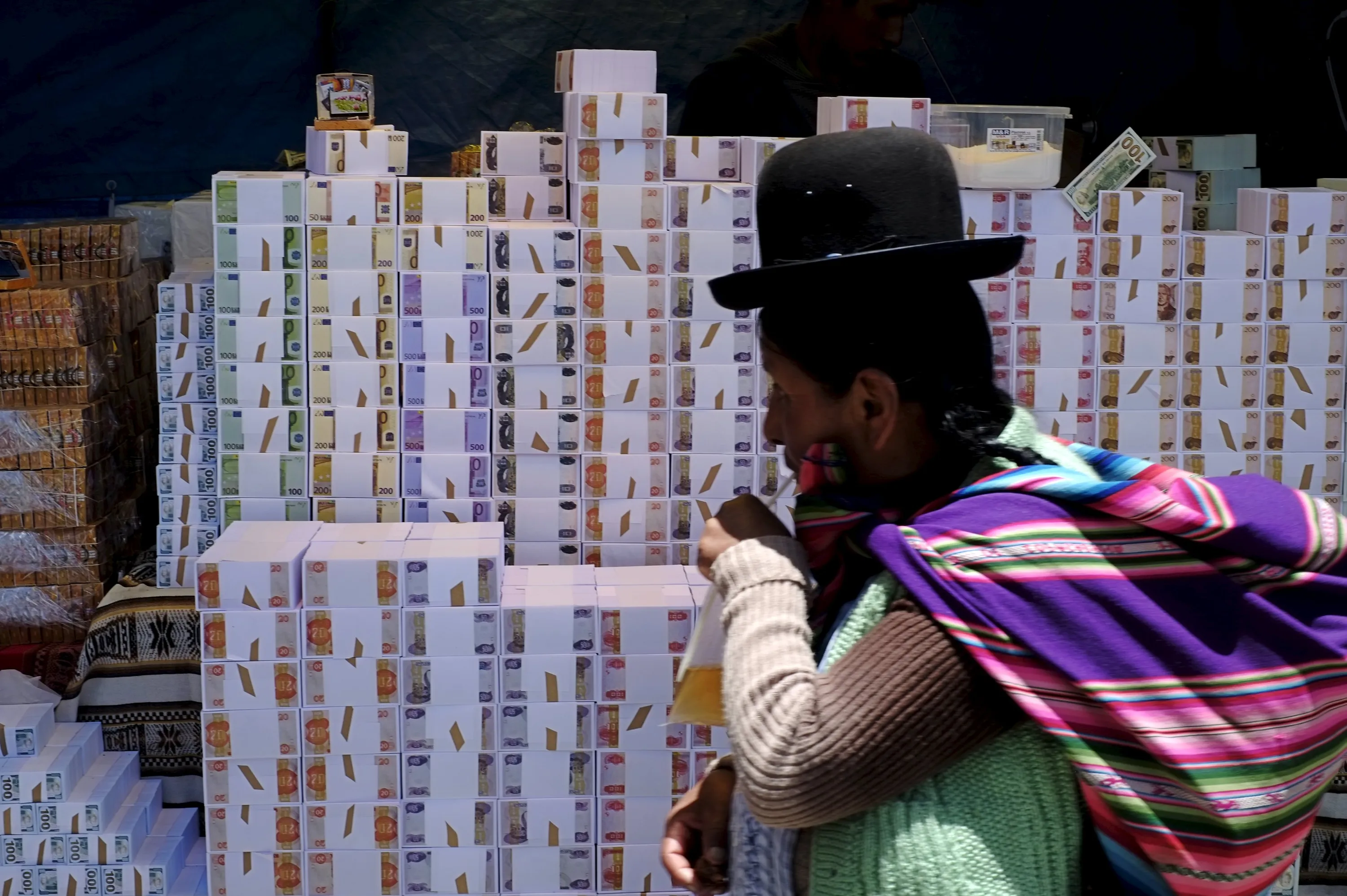 An Aymara woman stands next to a stall displaying miniature bundles of fake money to sell during the “Alasitas” fair in La Paz, Bolivia, January 19, 2016. During the “Alasitas” fair next January 24, Bolivians buy miniature versions of goods they would like to own at the fair, with the hope of acquiring them in real life during the year. (Photo by David Mercado/Reuters)