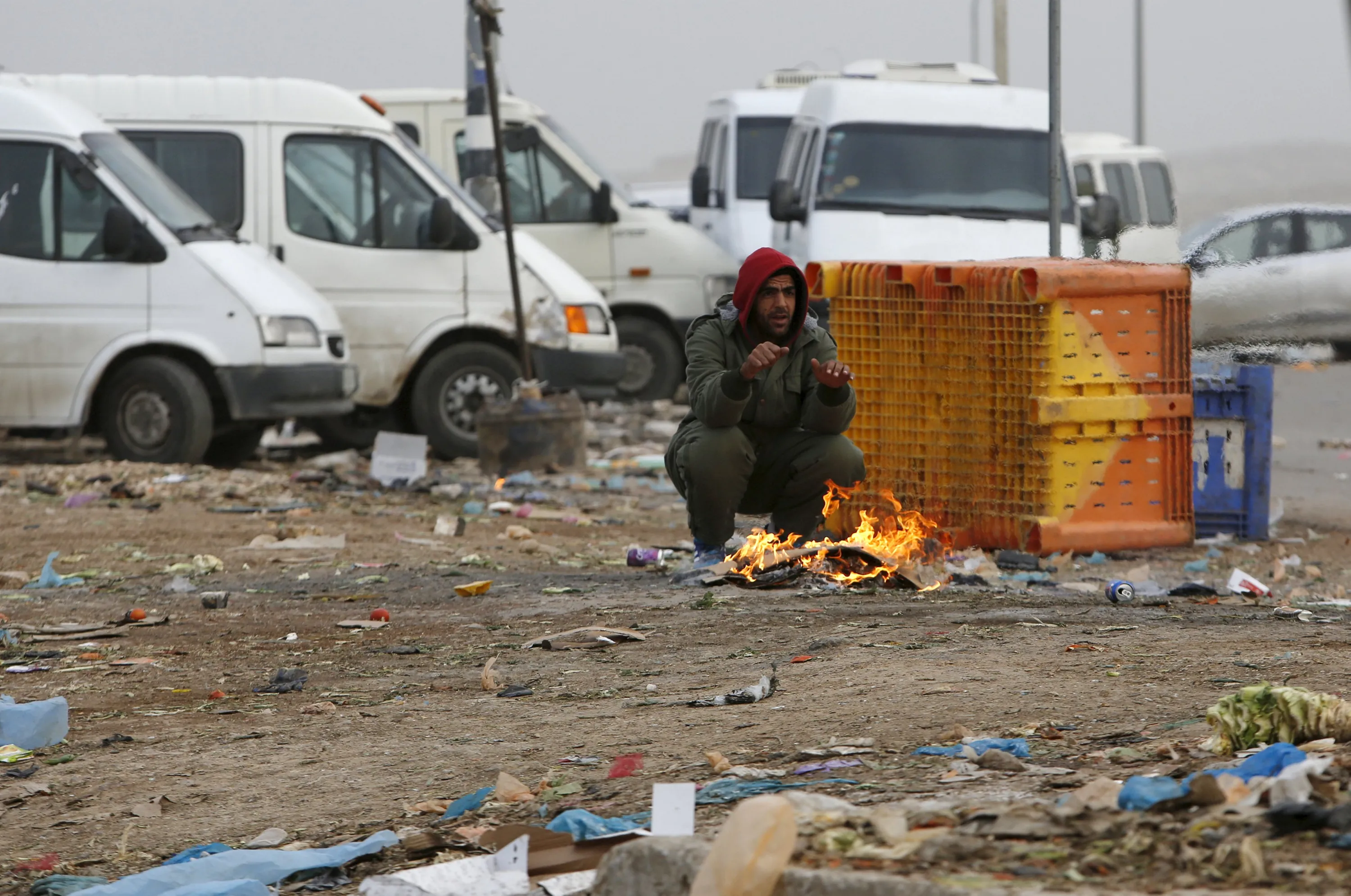 A Palestinian working in Israel warms himself by a fire as he waits to cross through the Israeli-controlled Mitar checkpoint south of the West Bank city of Hebron January 19, 2016. (Photo by Mussa Qawasma/Reuters)