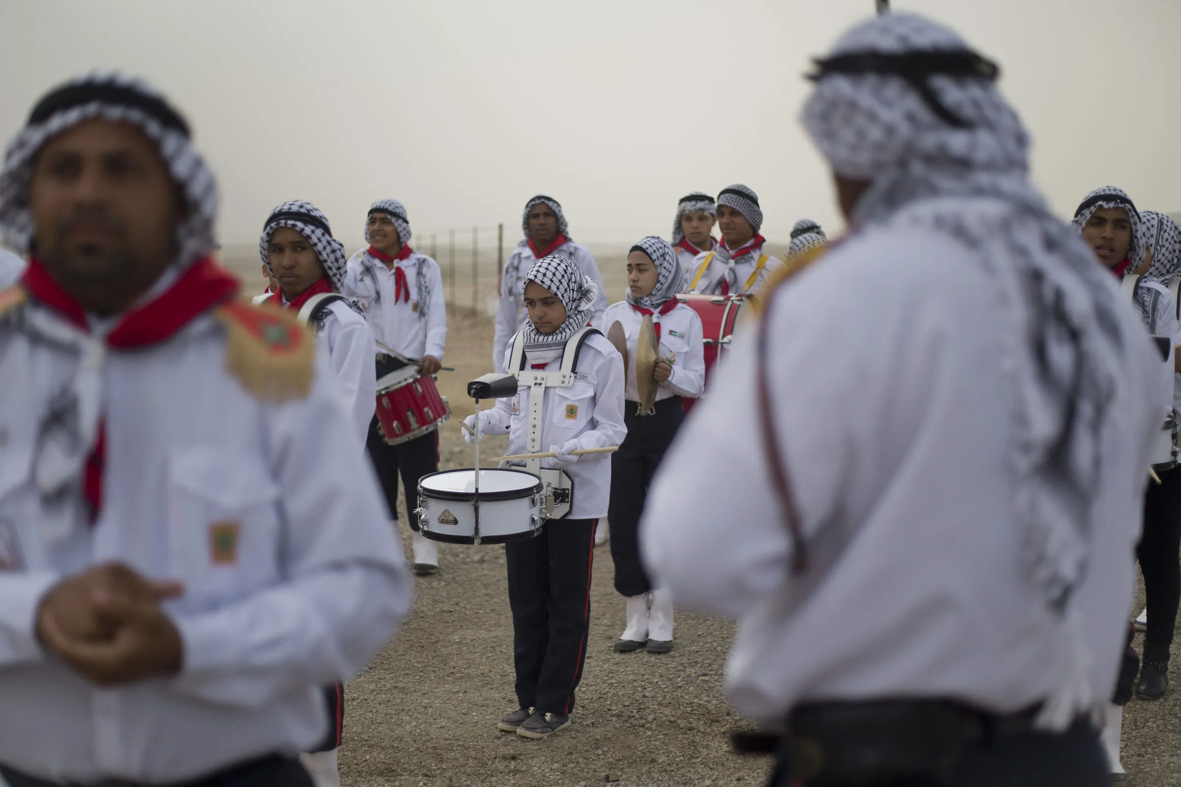 Palestinians boy scouts from Jericho wait for the start of the traditional Epiphany baptism ceremony at the Qasr-el Yahud baptism site in the Jordan river near the West Bank town of Jericho, Monday, January 18, 2016. The site is traditionally believed by many to be the place where Jesus was baptized. (Photo by Ariel Schalit/AP Photo)