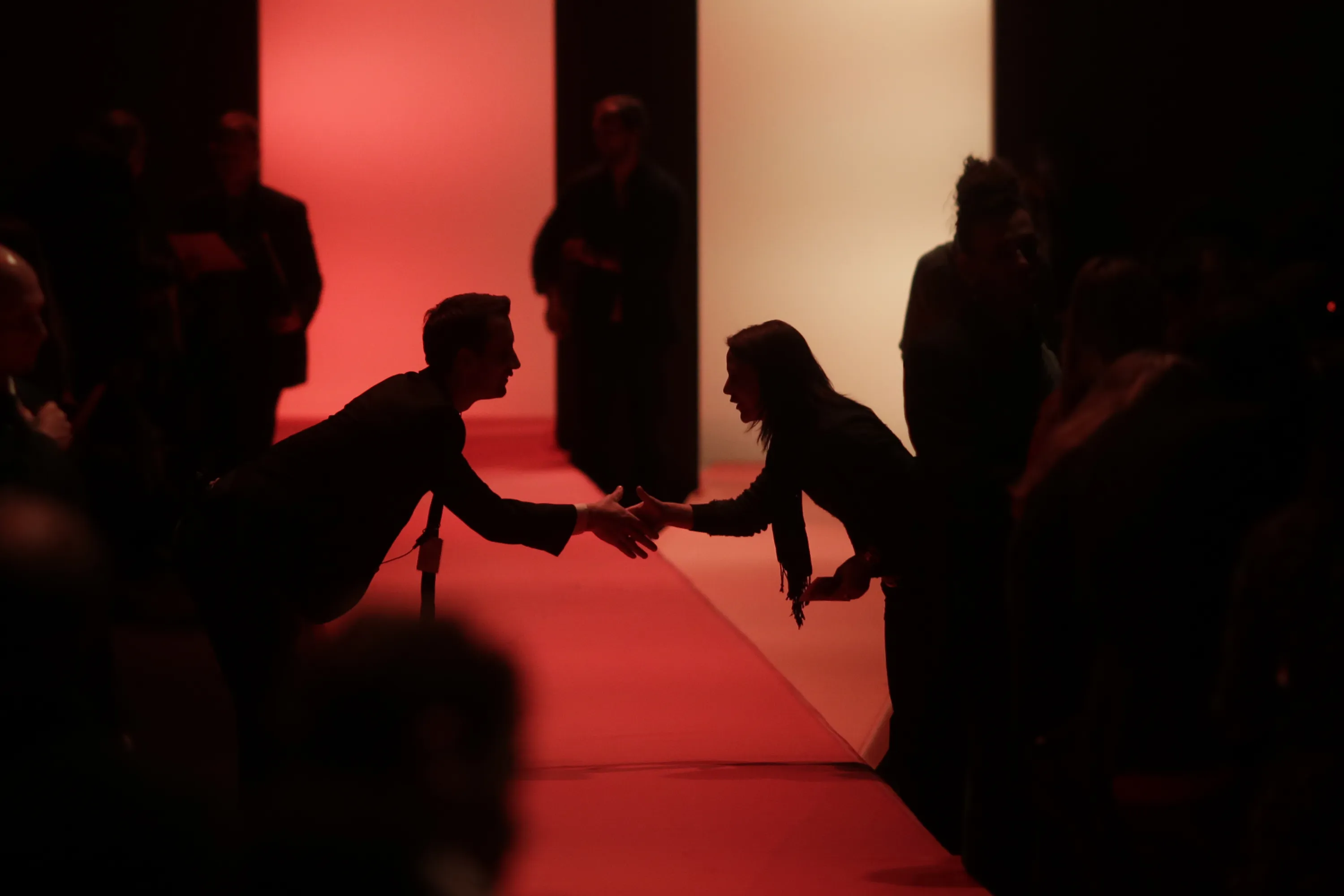Two visitors shake hands over the runway prior to the fashion show of designer Dorothee Schumacher during theFashion Week in Berlin, Wednesday, January 20, 2016. The Fall/Winter 2016/2017 collections are presented during the Berlin Fashion Week from Jan. 18 to 22. (Photo by Markus Schreiber/AP Photo)